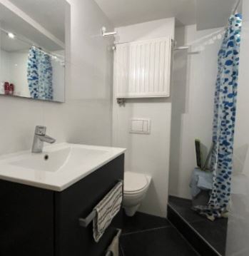 De open keuken is praktisch ingedeeld en voorzien van vaste inbouwapparatuur, waaronder een kookplaat, oven, afzuigkap en koelkast. Aansluitend is er ruimte voor een eettafel of werkplek. De slaapkamer is rustig gelegen en biedt voldoende plaats voor een tweepersoonsbed en kastruimte. De badkamer is modern en verzorgd uitgevoerd en beschikt over een inloopdouche, wastafel en toilet.