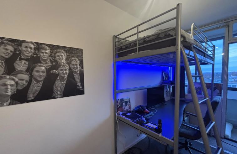 Eén van de vier kamers ligt op de begane grond.Eerste verdieping appartement: Via het trappenhuis kom je op de eerste verdieping van het appartement. Hier bevinden zich drie van vier kamers, waaronder de beschikbare kamer. Via de beschikbare kamer is er toegang tot het balkon, dat gedeeld wordt met één andere huisgenoot. Via de hal is er toegang tot de badkamer.