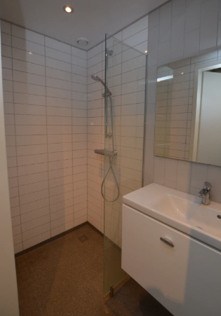 De keuken is voorzien van een elektrische kookplaat, afzuigkap en koelkast met vriesvak. De badkamer heeft een douche, wastafel met kastje eronder en een hangend toilet. Zowel de keuken als badkamer hebben een moderne uitstraling. In het complex zijn gemeenschappelijke wasruimtes met wasmachine en droger.