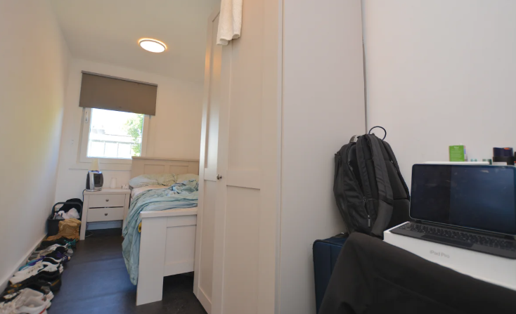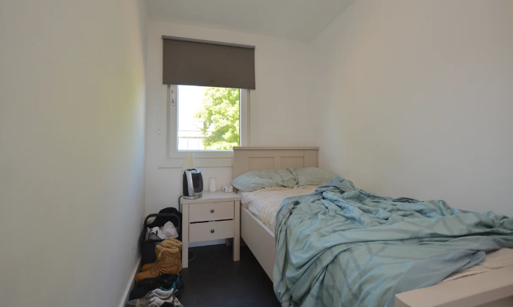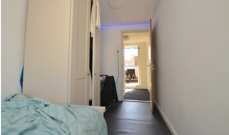 De kamer heeft voldoende plek voor je bed, bureau en een kledingkast.