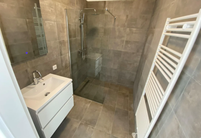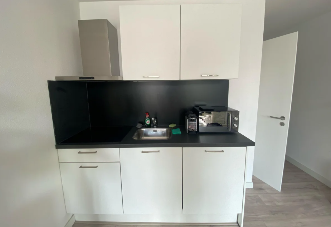 De keuken is uitgerust met inbouwapparatuur (elektrische kookplaat, afzuigkap, koel-vriescombi). Badkamer met inloopdouche, wastafel en spiegelkast. Gedeeld toilet. De foto's zijn van een vergelijkbare studio(!).