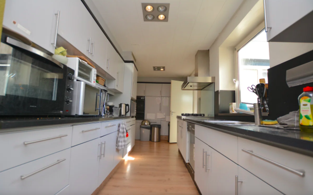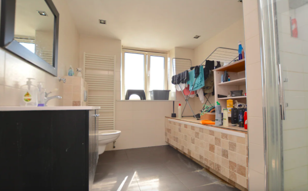 Je deelt hiermee de grote woonkamer van 43m2, de keuken wat beschikt over een vaatwasser, oven, wasbak met kraan, gasfornuis en erg veel werkruimte om je gerechten klaar te maken. Er zijn twee gezamenlijke badkamers aanwezig. Zo beschikt het huis nog over een groot dakterras en een balkon recht tegen over je kamer. HUURPRIJS & BORG De kale huurprijs bedraagt € 525 per maand exclusief nutsvoorzingen.