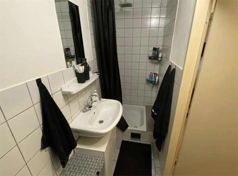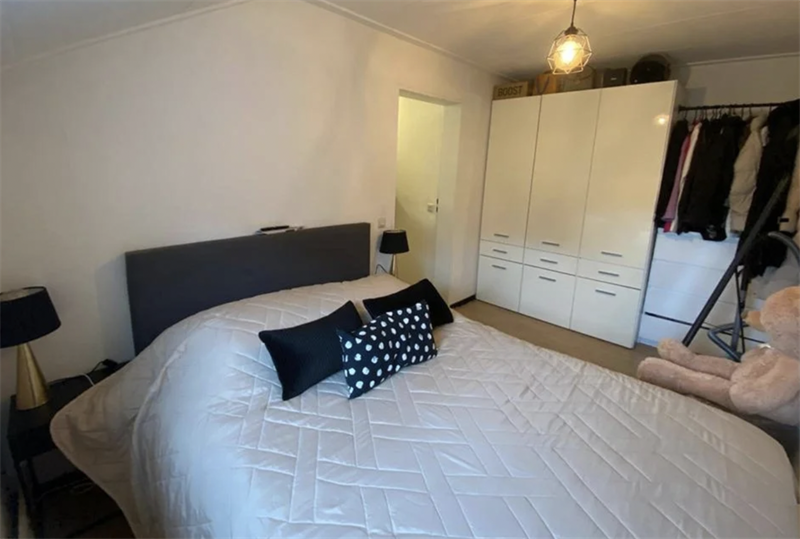 Badkamer voorzien van een douche, toilet en een wasbak. Aansluiting voor de wasmachine bevind in een aparte ruimte op de gang. De slaapkamer bevindt zich aan het einde van de gang.