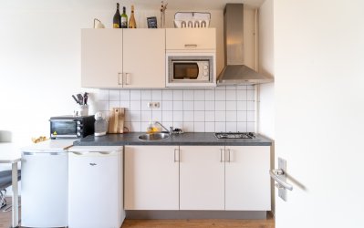 5-10 minuten fietsafstand van het complex. Indeling: Gezamenlijke entree met een lift die toegang biedt tot de betreffende etage van de studio. Bij binnenkomst tref je de keuken welke beschikt over diverse faciliteiten zoals een inductieplaat, magnetron en koelkast. De badkamer is voorzien van een toilet, douche en wasbak.