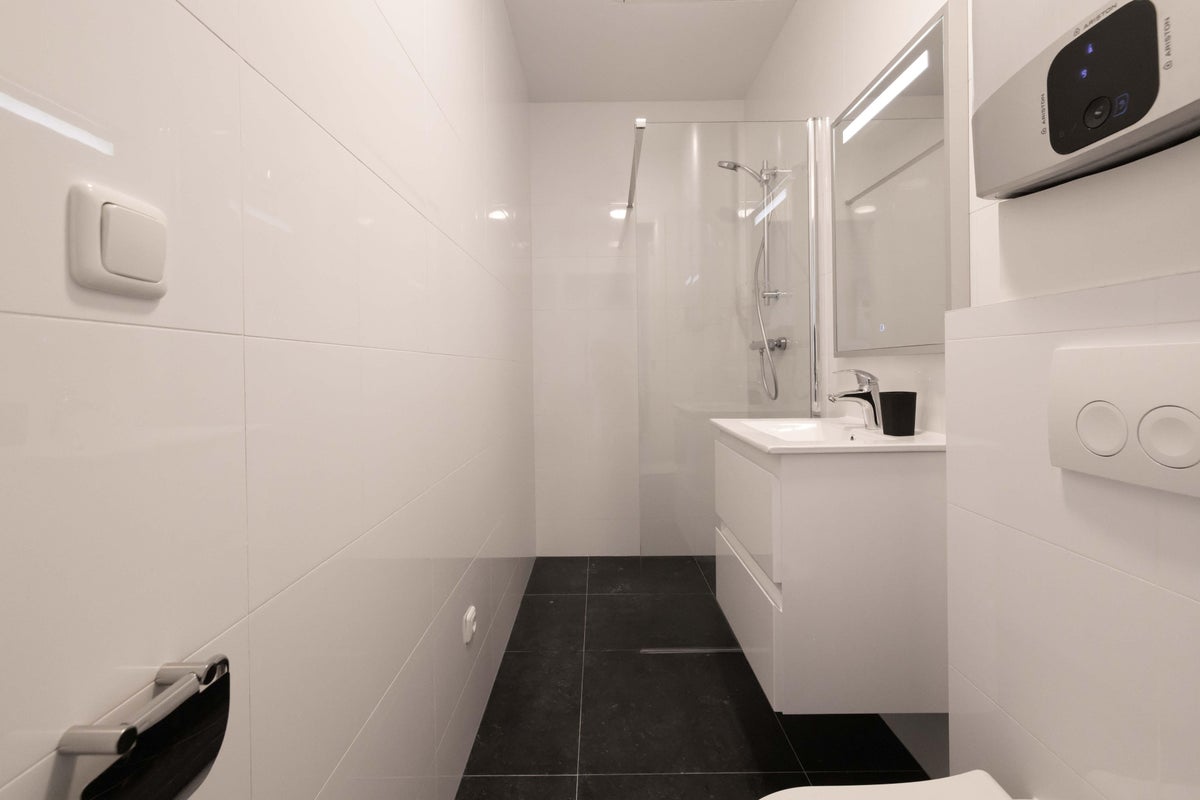 Entree, gang met links een de badkamer voorzien van toilet, wastafelmeubel met wasbak, design radiator en open douche met regendouche. Woonkamer met open keuken, voorzien van inductiekookplaat, koelkast met vriesvak, combin-oven/magnetron, vaatwasser en wasmachine.