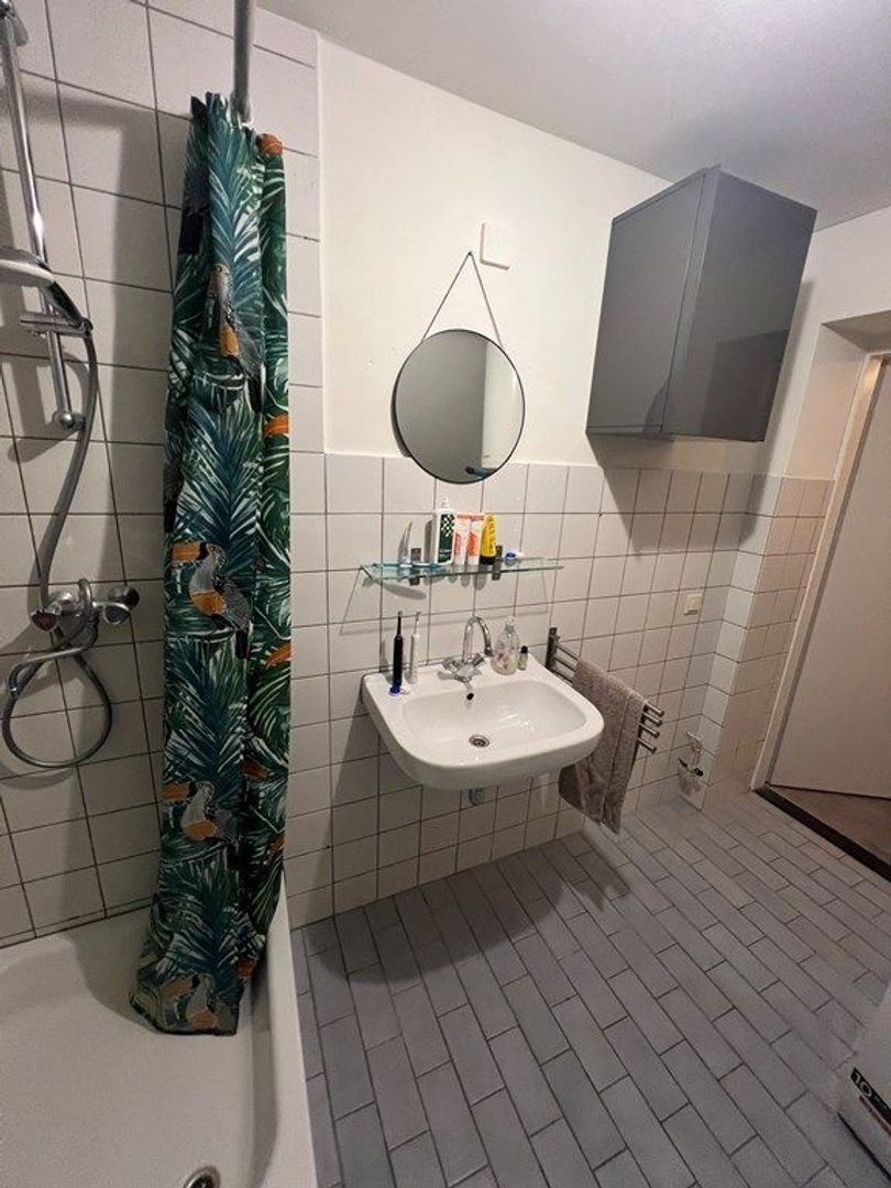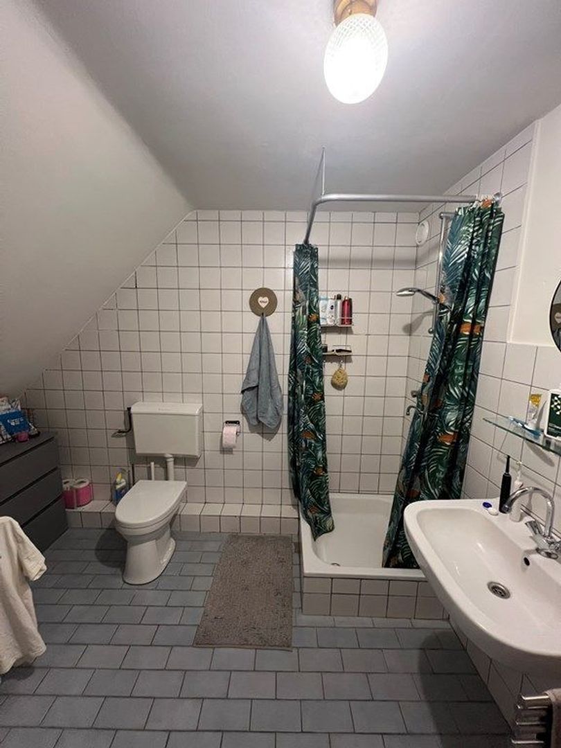 Vanuit de gang kom je eerst langs de half betegelde badkamer (7,5m) is voorzien van een wasbak en douche.