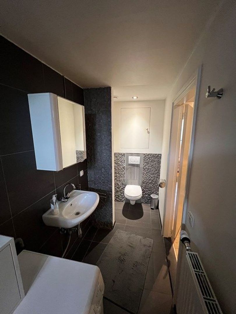 Badkamer (ca. 5 m²) ingericht met douchecabine, wastafelmeubel en hangend toilet.