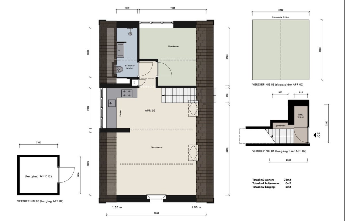 Entree met wasruimte en trap naar appartement. De woonkamer met open keuken is voorzien van diverse inbouwapparatuur. Keurige badkamer met douchecabine, wastafelmeubel en toilet.