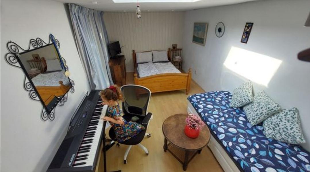 Kamer met basic keukenblok, douche, toilet en wasmachine..