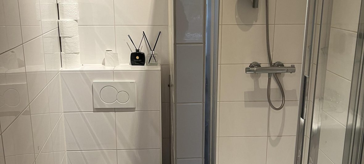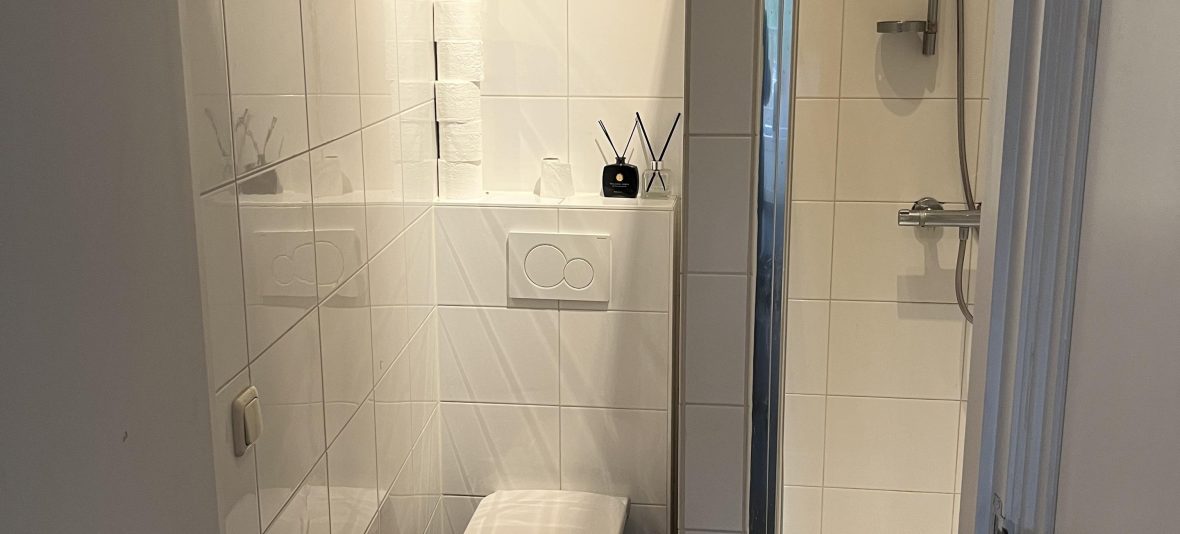 De badkamer is voorzien van een wastafel(meubel), een aparte douche en een toilet.