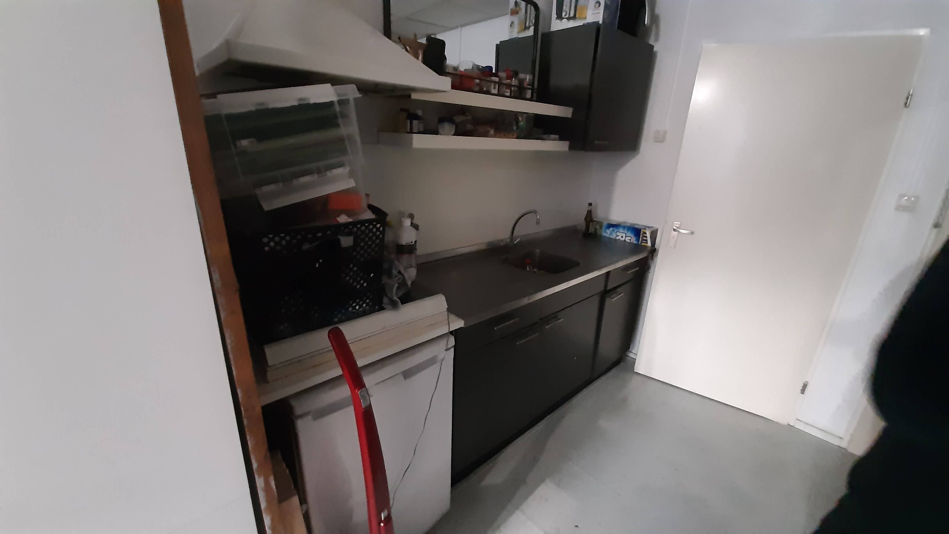 entree met trapopgang naar de eerste verdieping. We betreden de studio in de keuken. Hier treft u de volgende apparatuur; gaskookplaat, afzuigkap en koelkast. Tegenover de keuken treft u de badkamer .