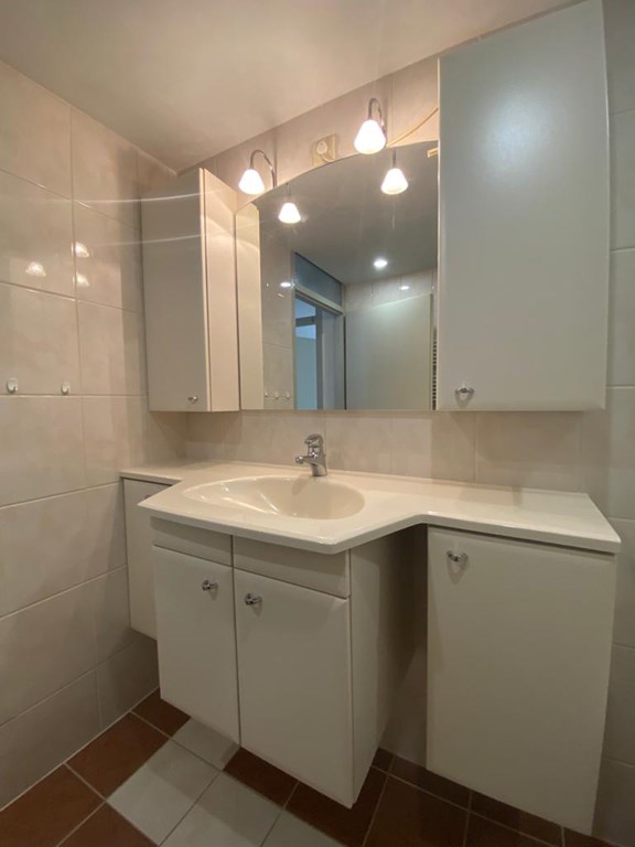 De badkamer heeft een tweede toilet, een douchecabine en een wastafelmeubel compleet voorzien van inbouwspots. Ook hier is voldoende opbergruimte.