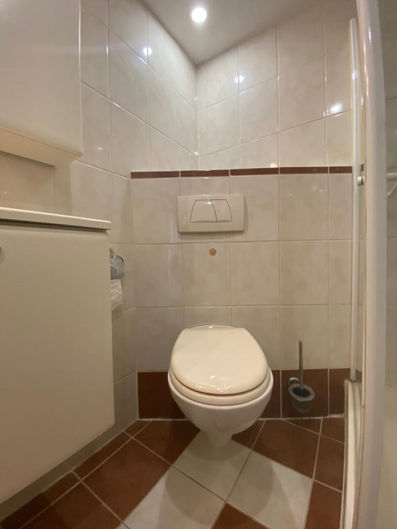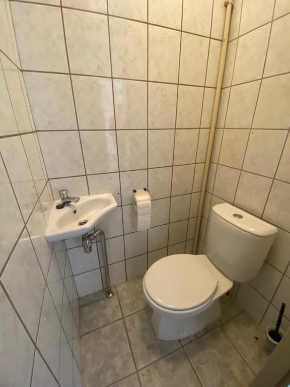 Het eerste toilet bevindt zich op de begane grond bij de entree. Naast het toilet is een berging kast waar de gezamenlijke wasmachine is geplaatst.