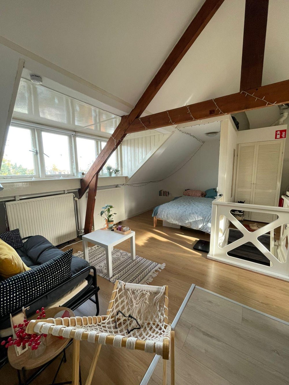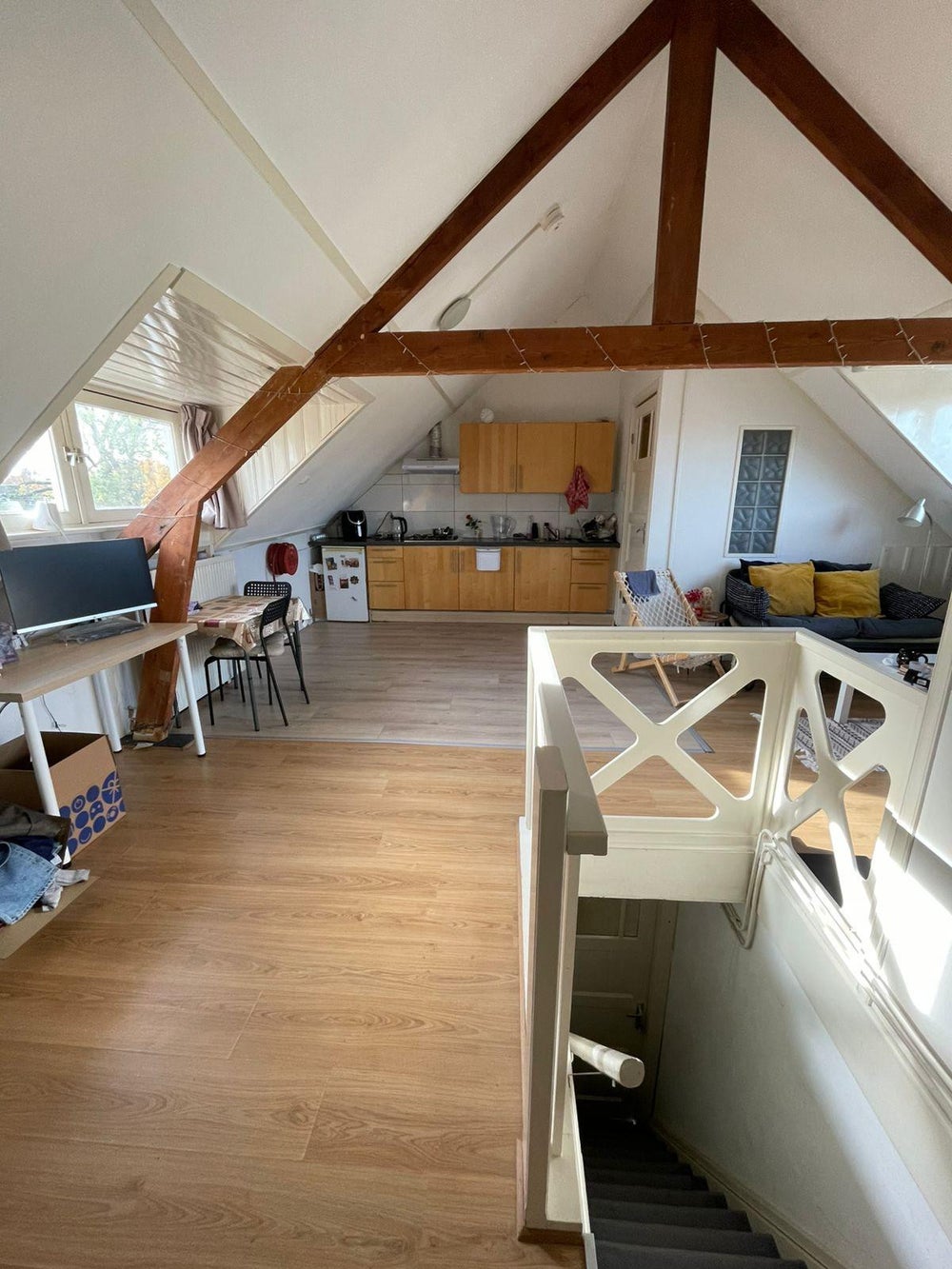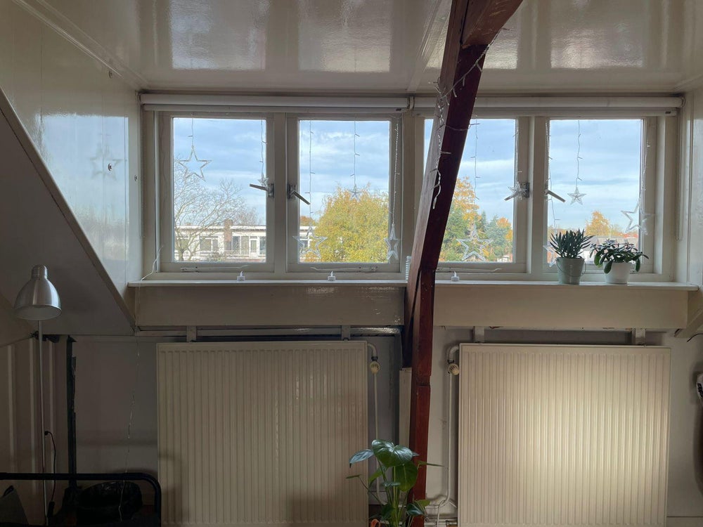 Deze studio, gelegen op de zolder etage, heeft alle eigen faciliteiten en is voorzien van een eigen keuken, badkamer met douche, wastafel en toilet.
