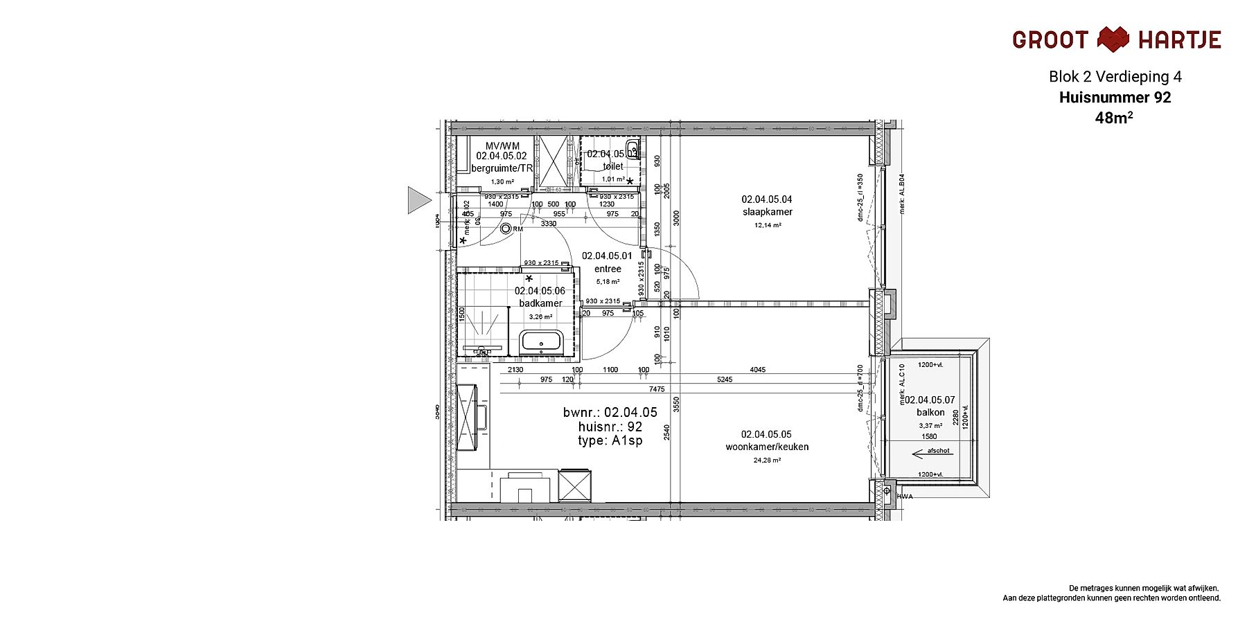De woonkamer met open keuken heeft toegang tot het balkon, waar je fijn buiten kunt zitten. De keuken is uitgerust met een vaatwasser, kookplaat met afzuigkap, koel-vriescombinatie en een combimagnetron.De badkamer heeft een douche en wastafel. Het toilet is apart. De slaapkamer is 12 m² en biedt genoeg ruimte voor een tweepersoonsbed en kast.