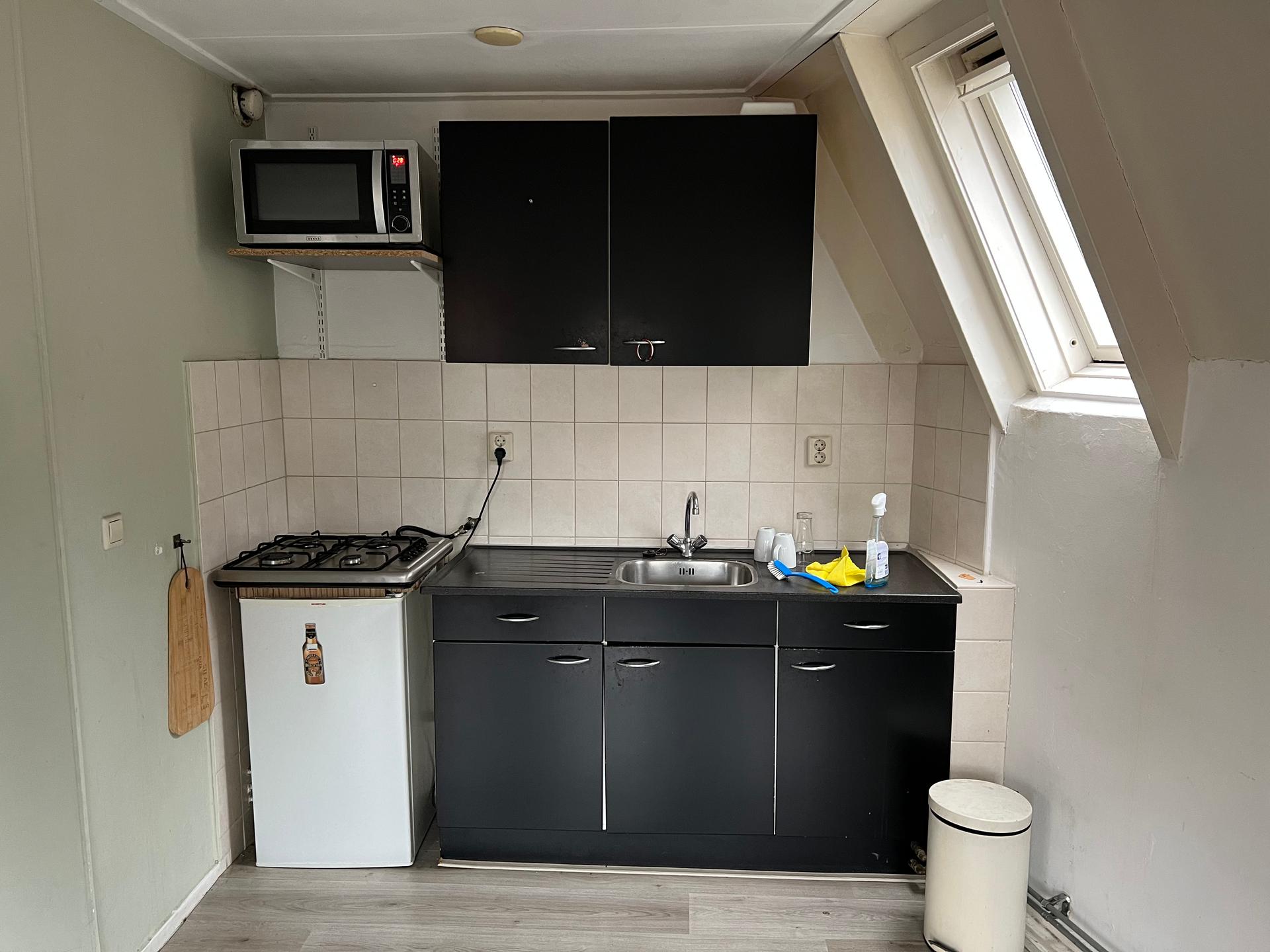 Woonkamer met keukenblok, slaapkamer en badkamer.