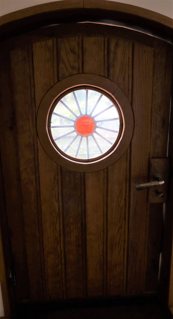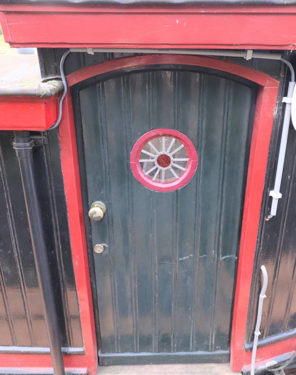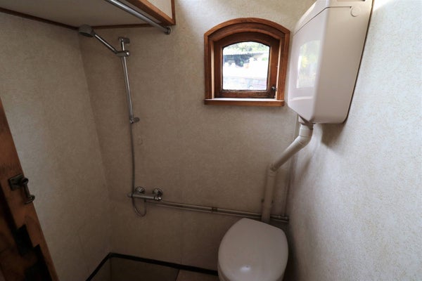 A must-see! Via the private path, you walk across the terrace to the ship's door, featuring a small stained-glass window. Upon entering the houseboat, you'll find the **cabin (living room - 13 m²)** to your left and the **galley (kitchen - 3 m²)** to your right. The cabin includes an authentic wooden bench with built-in storage. From here, you walk toward the bow, where you'll find the **bedroom (5.5 m²)** with a fixed bed, offering storage space underneath as well as at the bow side.