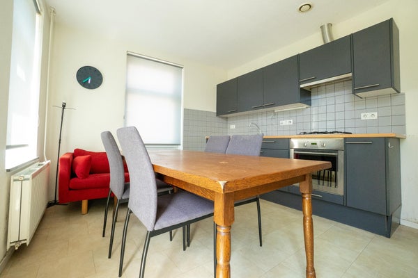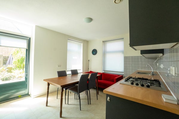 Zo is er een grote, zonnige achtertuin - perfect om te ontspannen of te studeren in de buitenlucht - en een gezamenlijke keuken op de begane grond. Verder vind je op deze verdieping een separaat toilet en op de bovenverdieping een gedeelde badkamer.