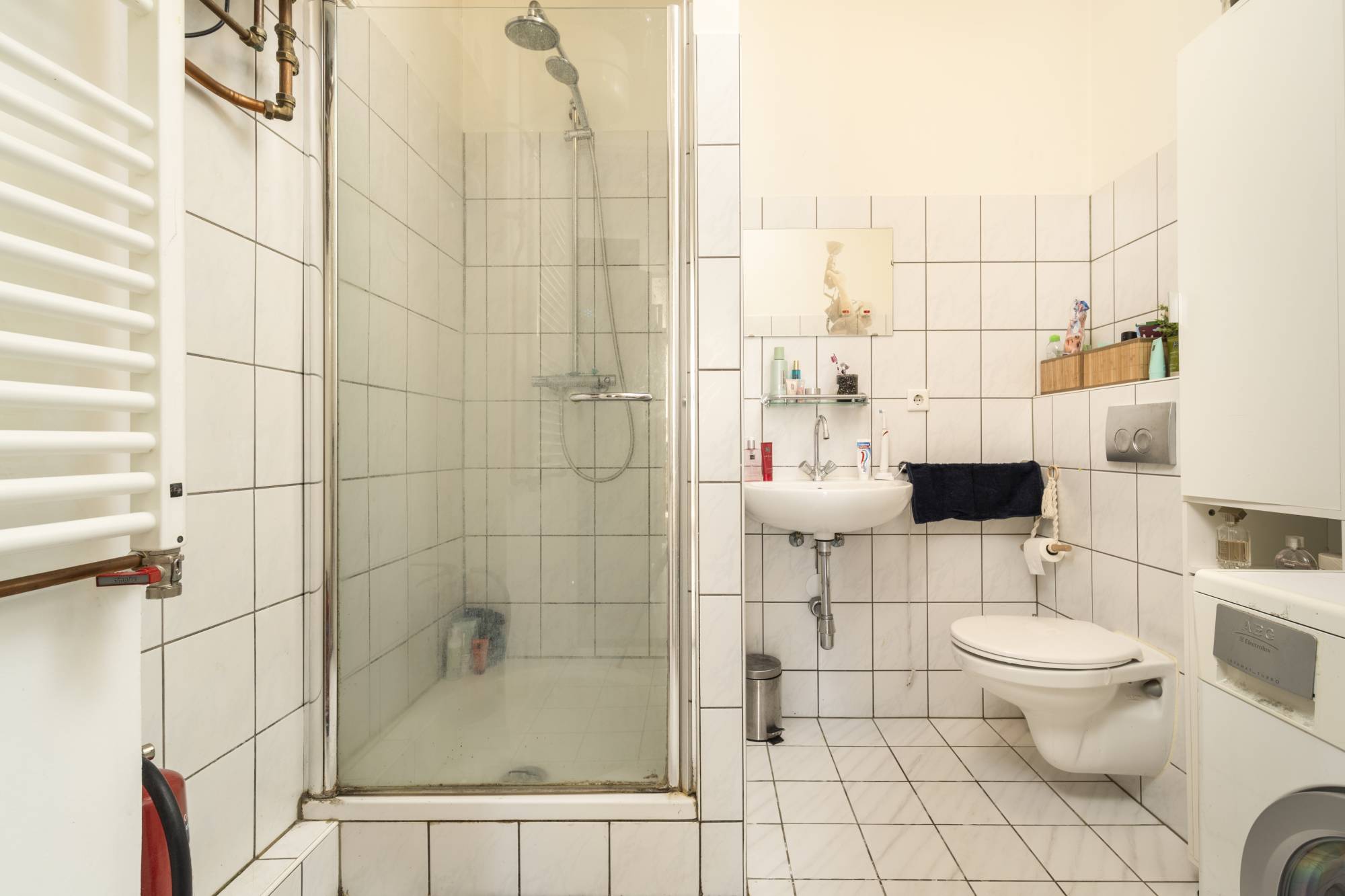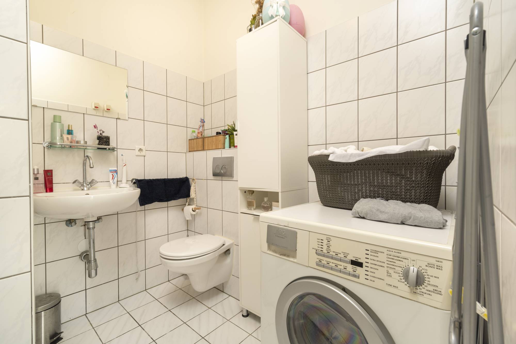 Aangrenzend aan de slaapkamer ligt de badkamer, uitgerust met een toilet, douche, wastafel en een aansluiting voor de wasmachine.