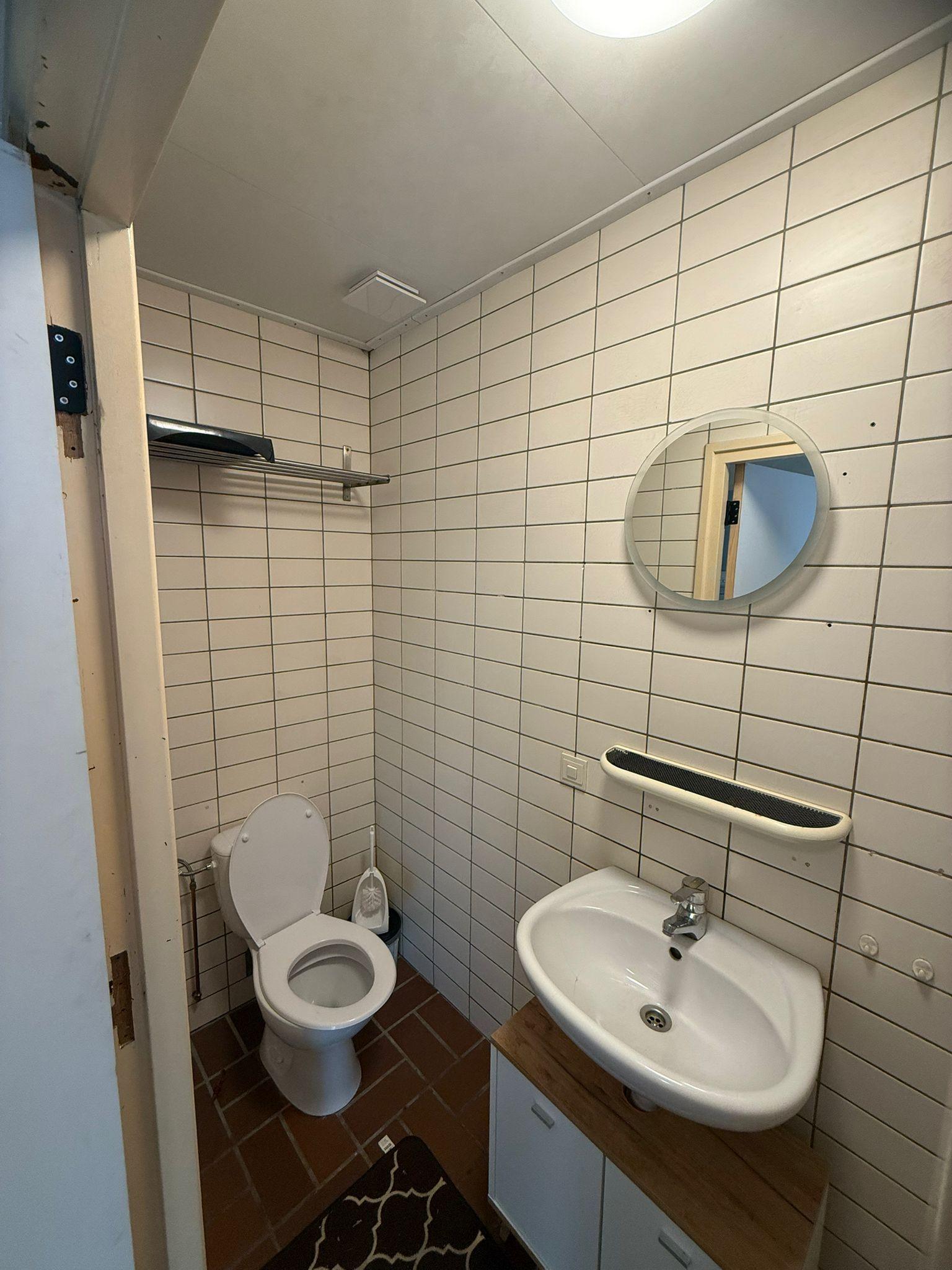 De nette badkamer is uitgerust met een douche, toilet, wastafel en een badkamermeubel.