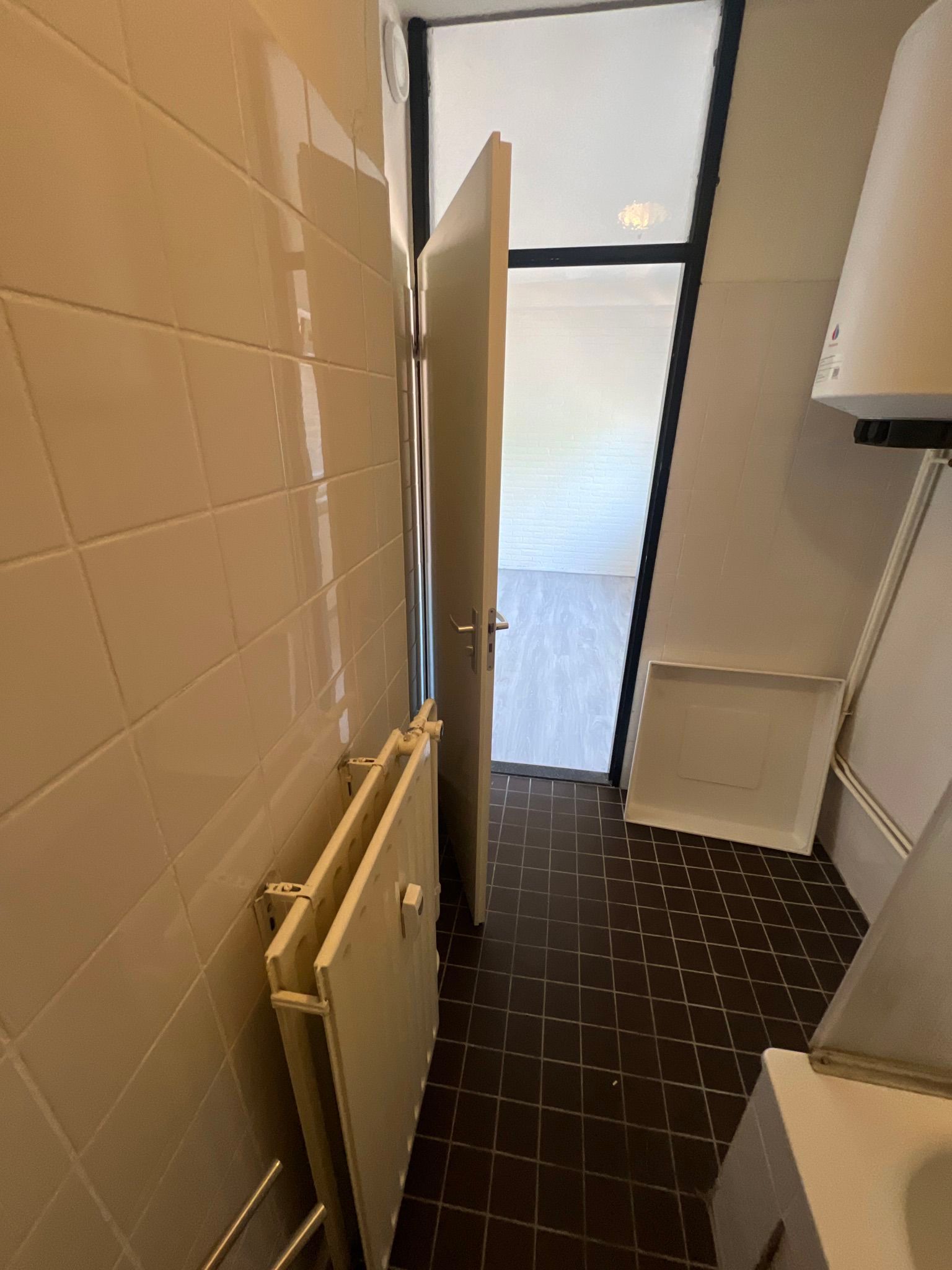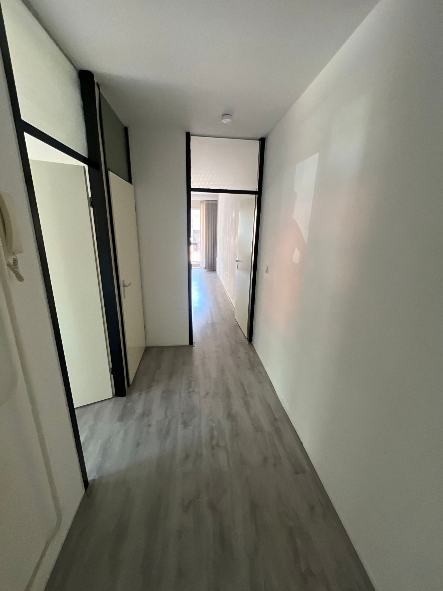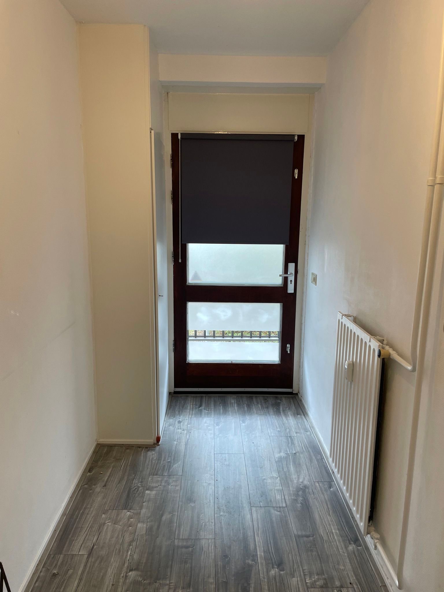 Entree bestaande uit een hal met meterkast, separaat toilet, toegang tot de slaapkamer en het woon- keukengedeelte met balkon.