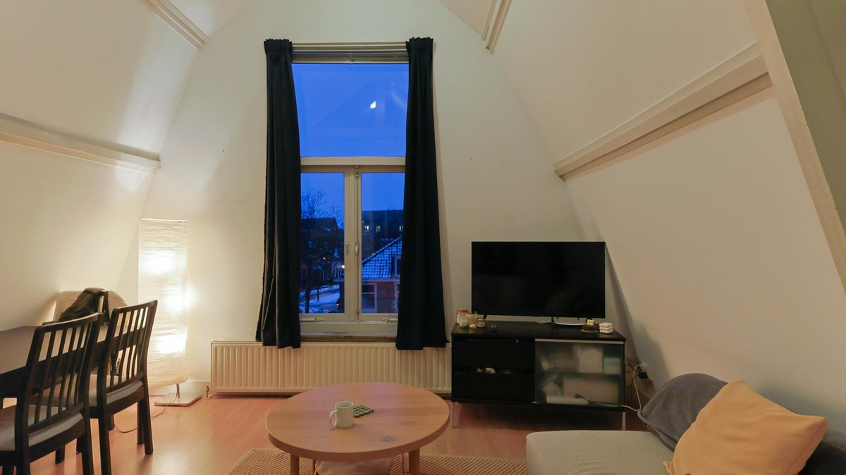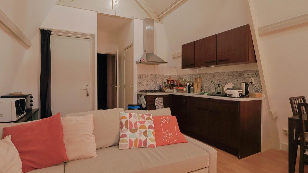 De lichte woonkamer is ruim opgezet en heef een fraai uitzicht. De open keuken is voorzien van diverse apparatuur. De ruime slaapkamer is gelegen aan de rustige achterzijde. De badkamer is compleet met douchehoek, toilet en wastafel.