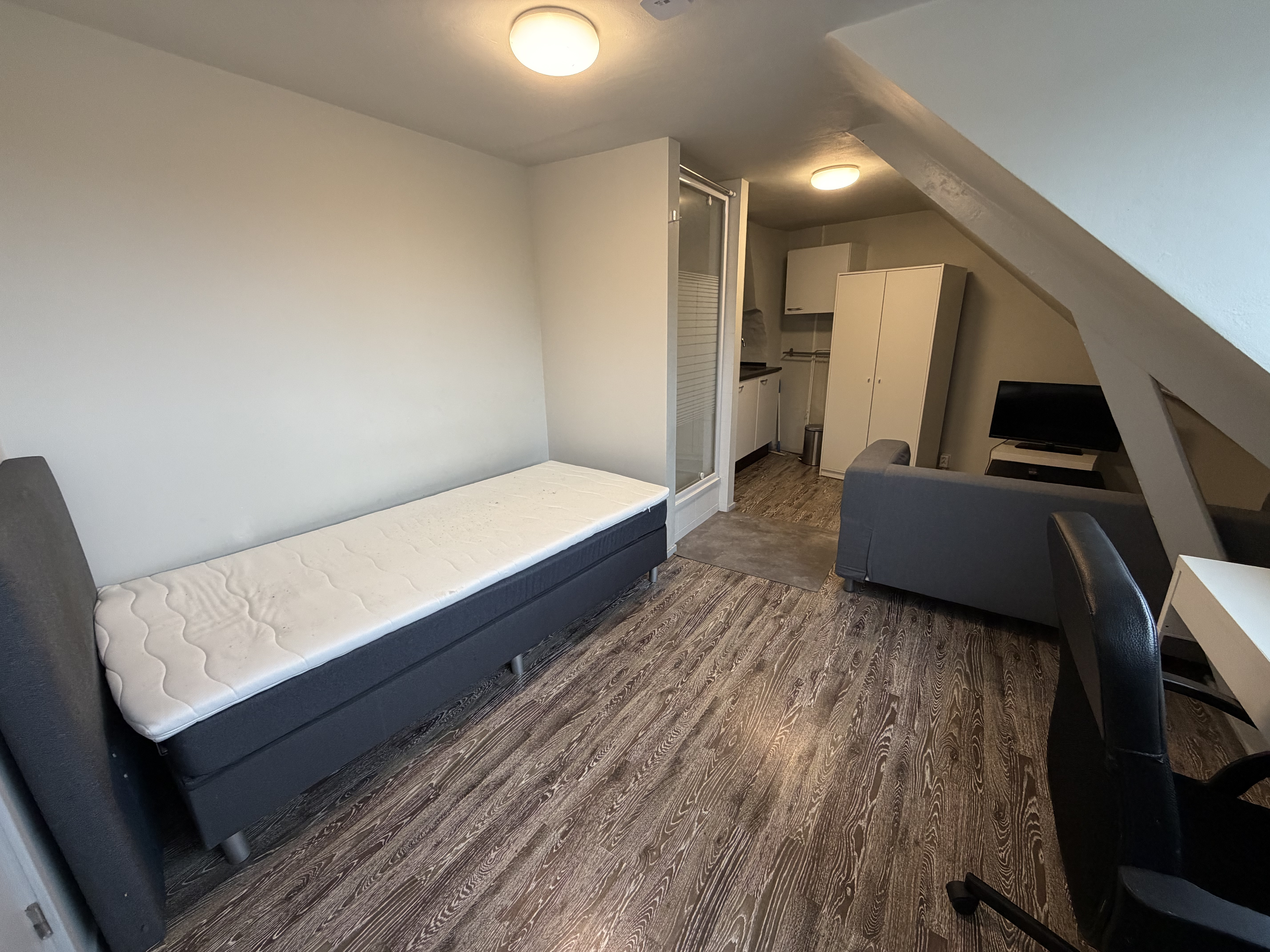 Available from: February 1st, 2026. The studio is located at the Laagstraat 275, a 5-minute bike ride from the city center and 15 minutes from TU/e + Fontys., The furnished studio at Laagstraat 275 in Eindhoven is located in a complex consisting of three floors, with a total of seven studios., The studio is located on the top floor at the rear of the complex and has its own shower cabin and kitchenette. The kitchen is equipped with a 2-burner hob, fridge-freezer, and extractor hood. The two toilets and the washing machine are shared with the other residents., The studio is furnished with a sofa, bed, wardrobe, desk chair, and desk.