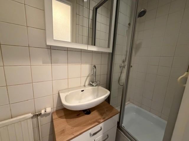 Nette badkamer met douche, vaste wastafel en toilet