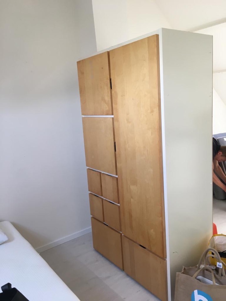 De woon/slaapkamer heeft een Auping bed (1.40 breed) met een 3 jaar oud wasbaar Ikea matras, een kapstok, lange spiegel, een kledingkast, 2,5-zitbank, salontafel, lage kast, bureautafel en bureaustoel. De doucheruimte heeft een plankenkast (antiek) en wasmand. De wc/wasmachineruimte heeft een ladekast.