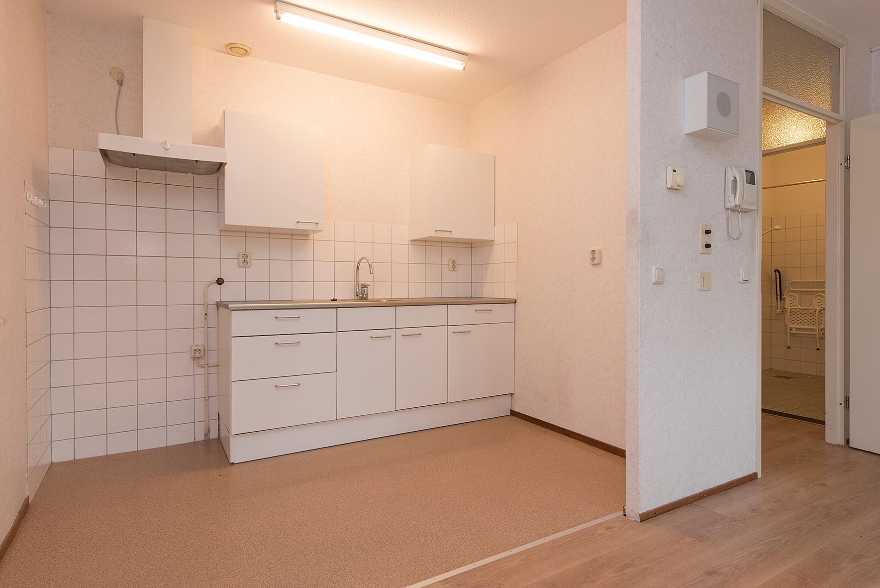 Wanneer u het appartement binnenkomt via de hal heeft u toegang tot de badkamer, slaapkamer en woonkamer met keuken. Vanuit de slaapkamer kunt u het terras betreden en heeft u ook toegang tot de badkamer.