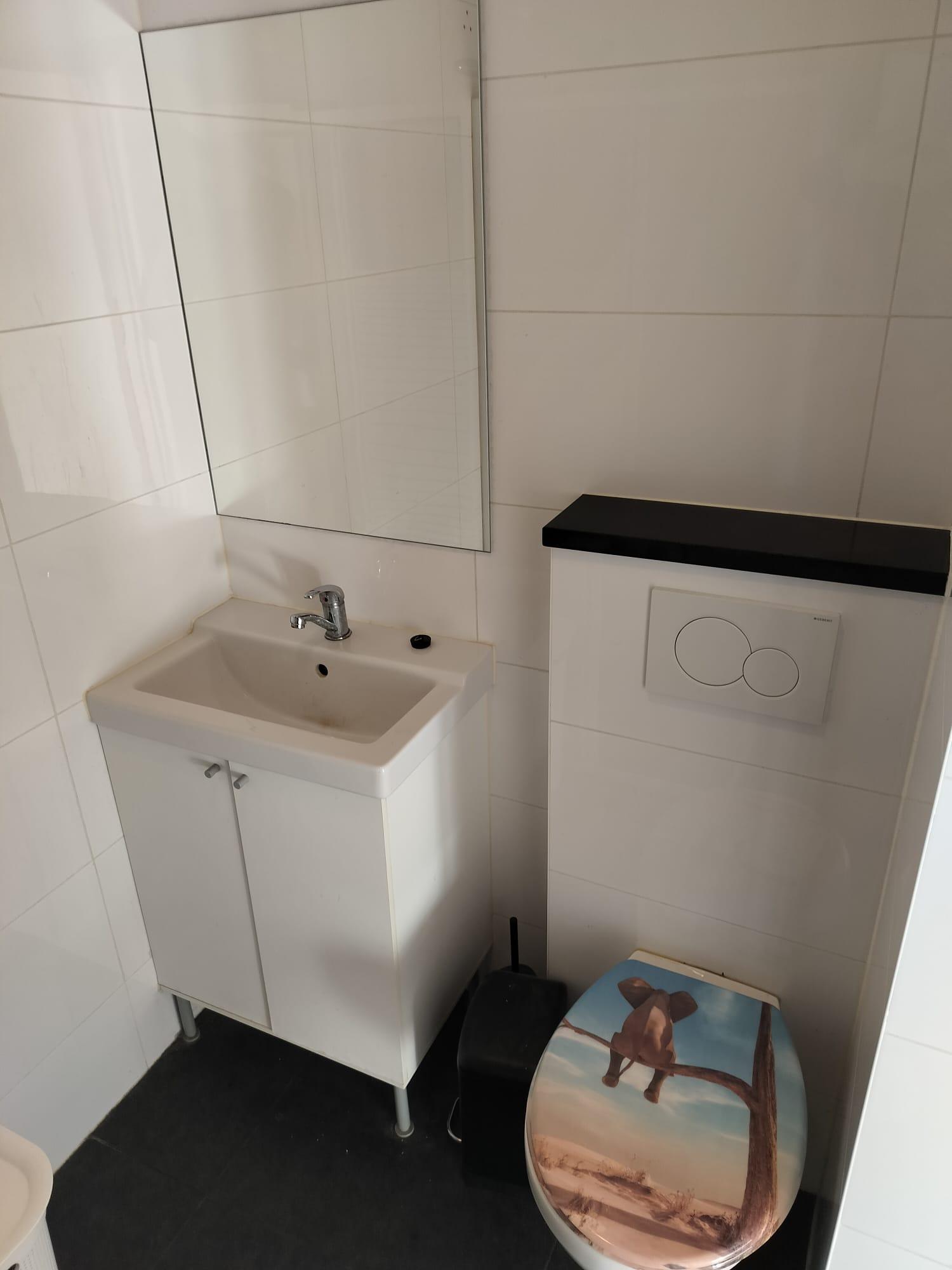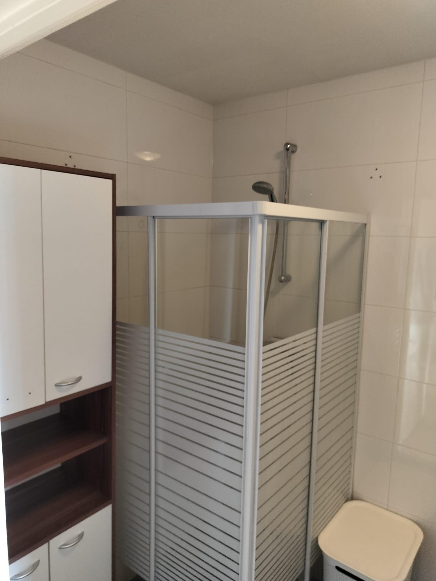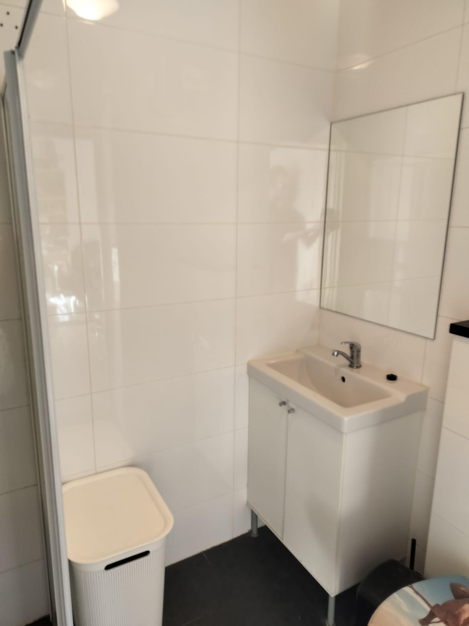 Nette moderne badkamer met meubel en douchewand.