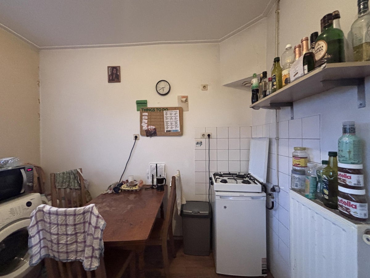 Vanuit de hal is tevens toegang tot de gezamenlijke keuken, die is uitgerust met een 4-pitsgasfornuis, een koelkast en een magnetron. Tevens staat de gedeelde wasmachine in de keuken. Eén van de vier kamers ligt op de begane grond.