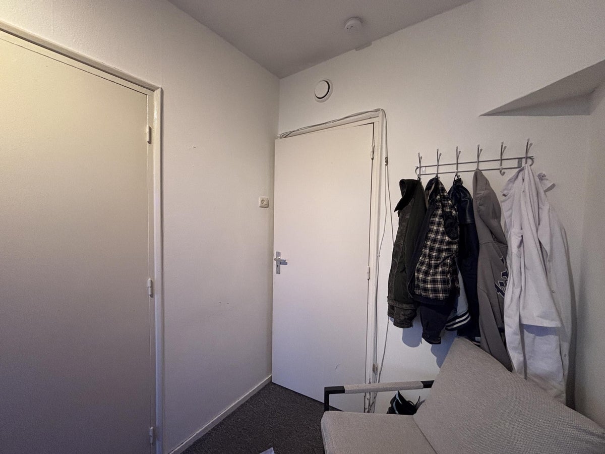 Via het trappenhuis kom je op de eerste verdieping van het appartement. Hier bevinden zich drie van vier kamers, waaronder de beschikbare kamer.
