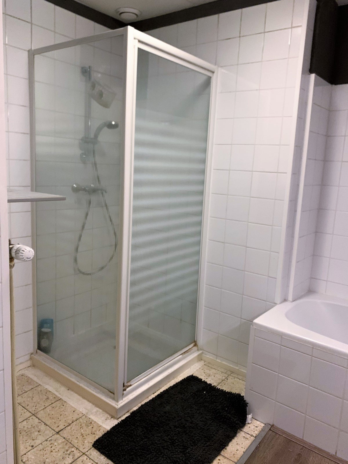 De gedeelde badkamer (2024) is gelegen tegenover de kamer en beschikt over een douche en wastafel. Er zijn 2 aparte toiletten. (de foto's zijn van de oude badkamer)