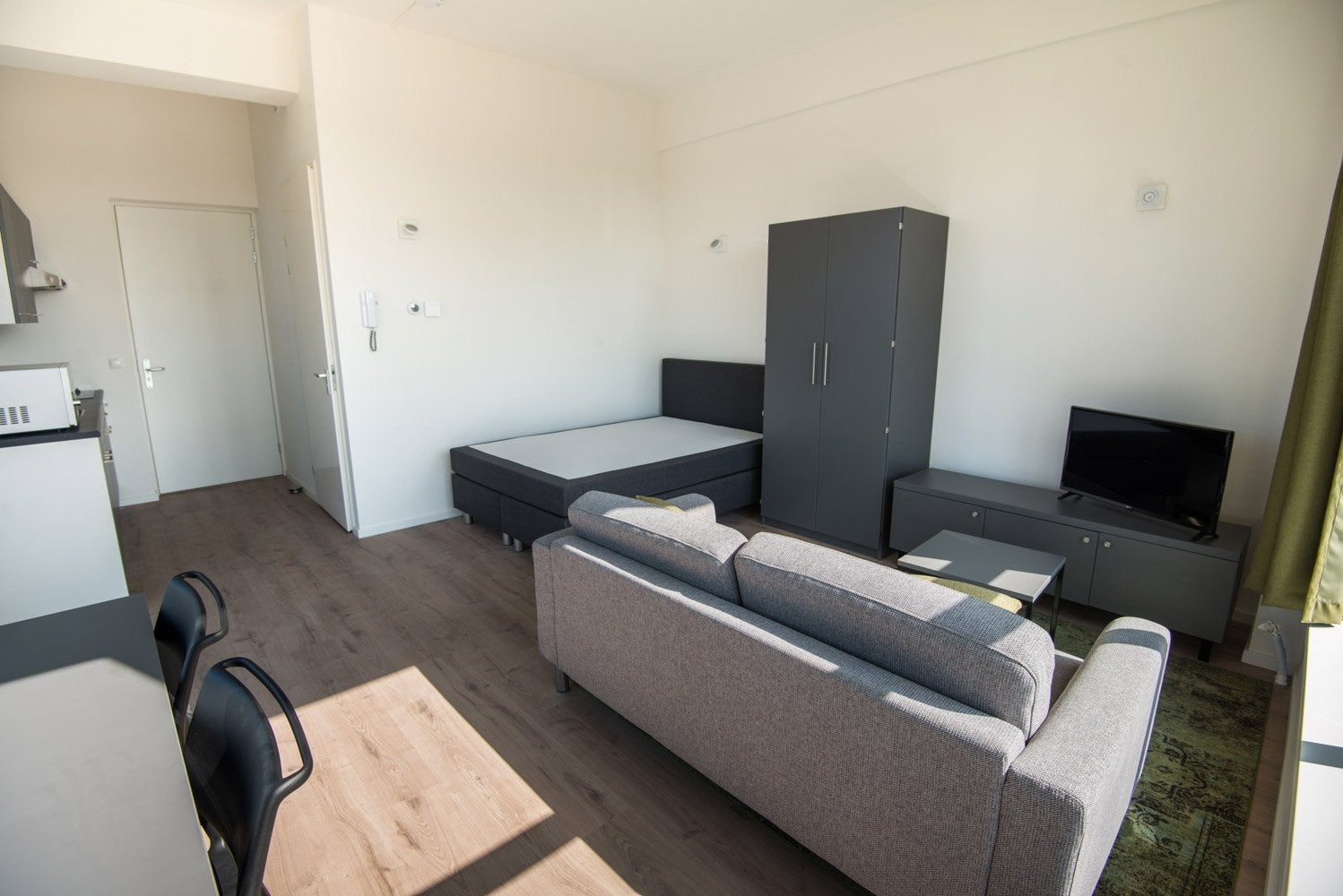 Lay - out; entrance of the building - with the stairs or elevator you go to the 4th floor - entrance apartment - modern open kitchen - double bed and a small living area - new bathroom