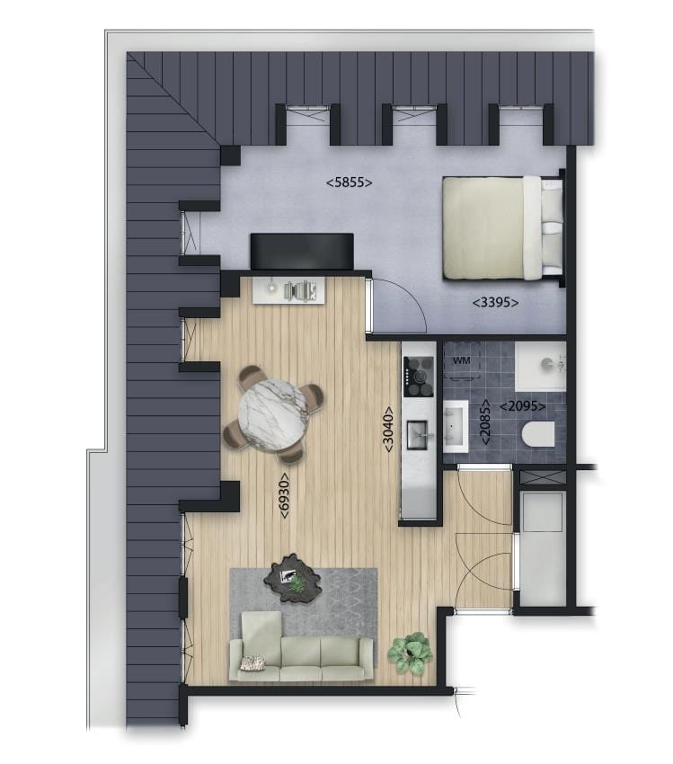 Het appartement beschikt over een lichte slaapkamer, een open keuken met basis inbouwapparatuur en een frisse badkamer met douche en wastafel. Het appartement is strak en modern afgewerkt. Het ingrediënt om de ruimtes naar eigen smaak in te richten.