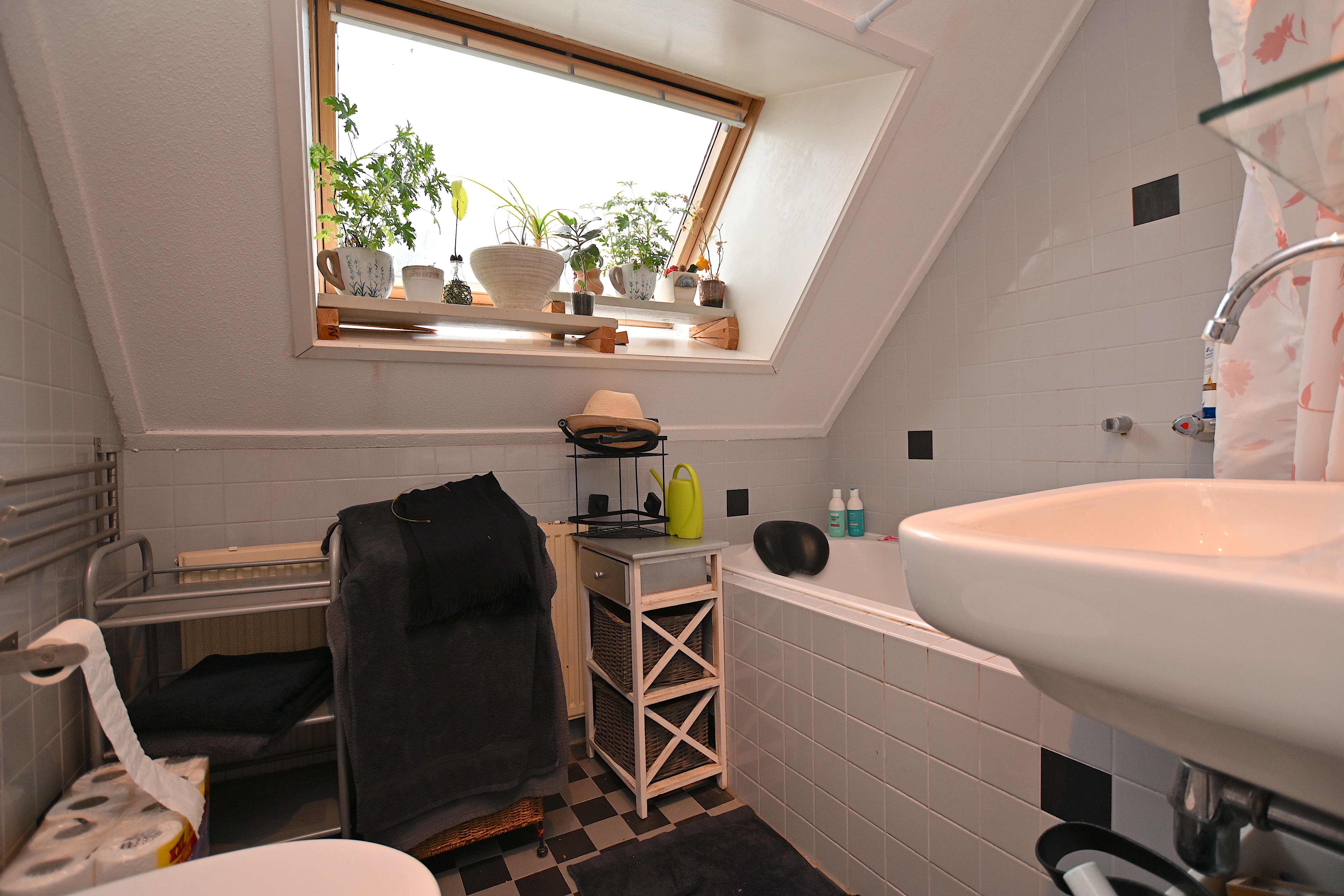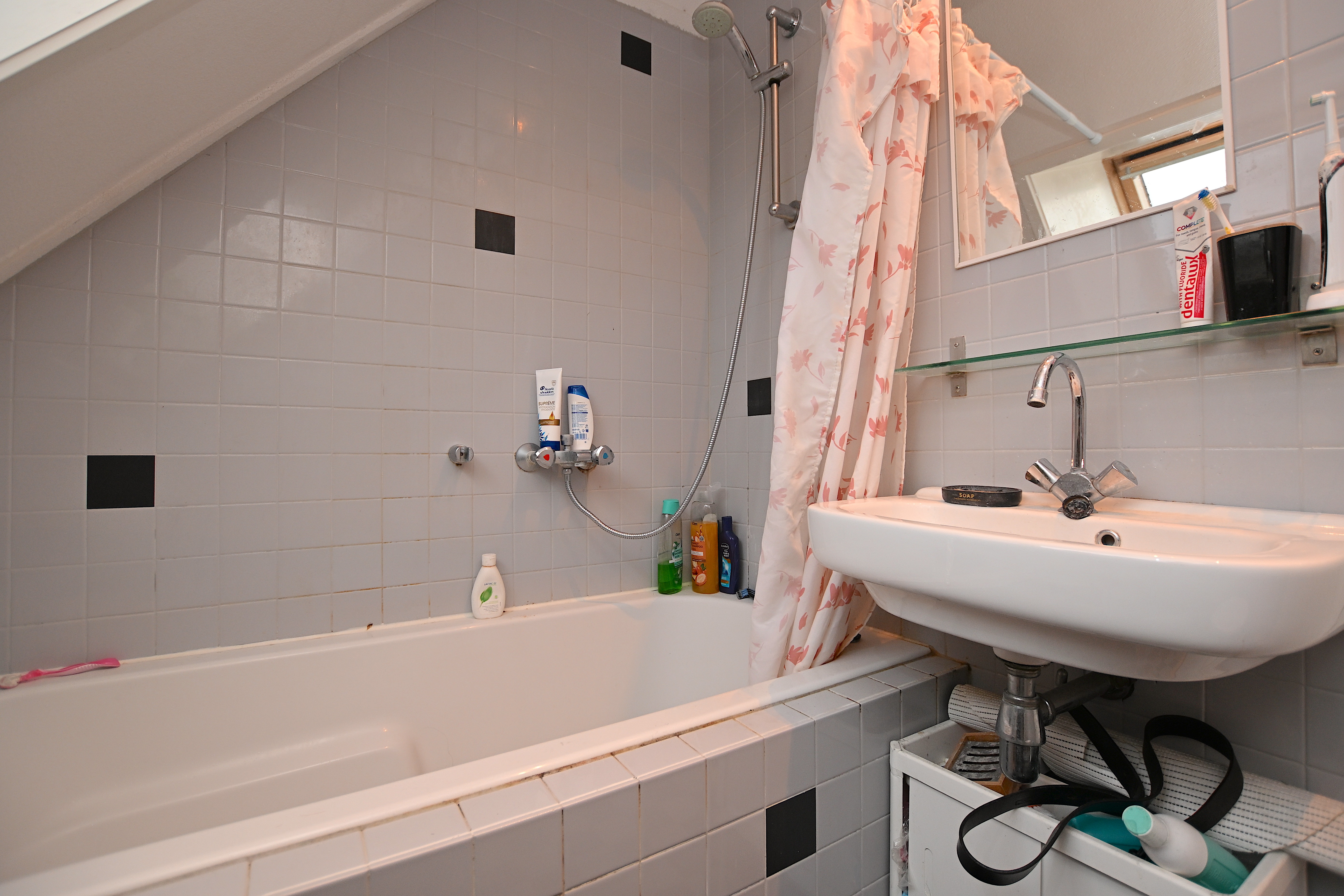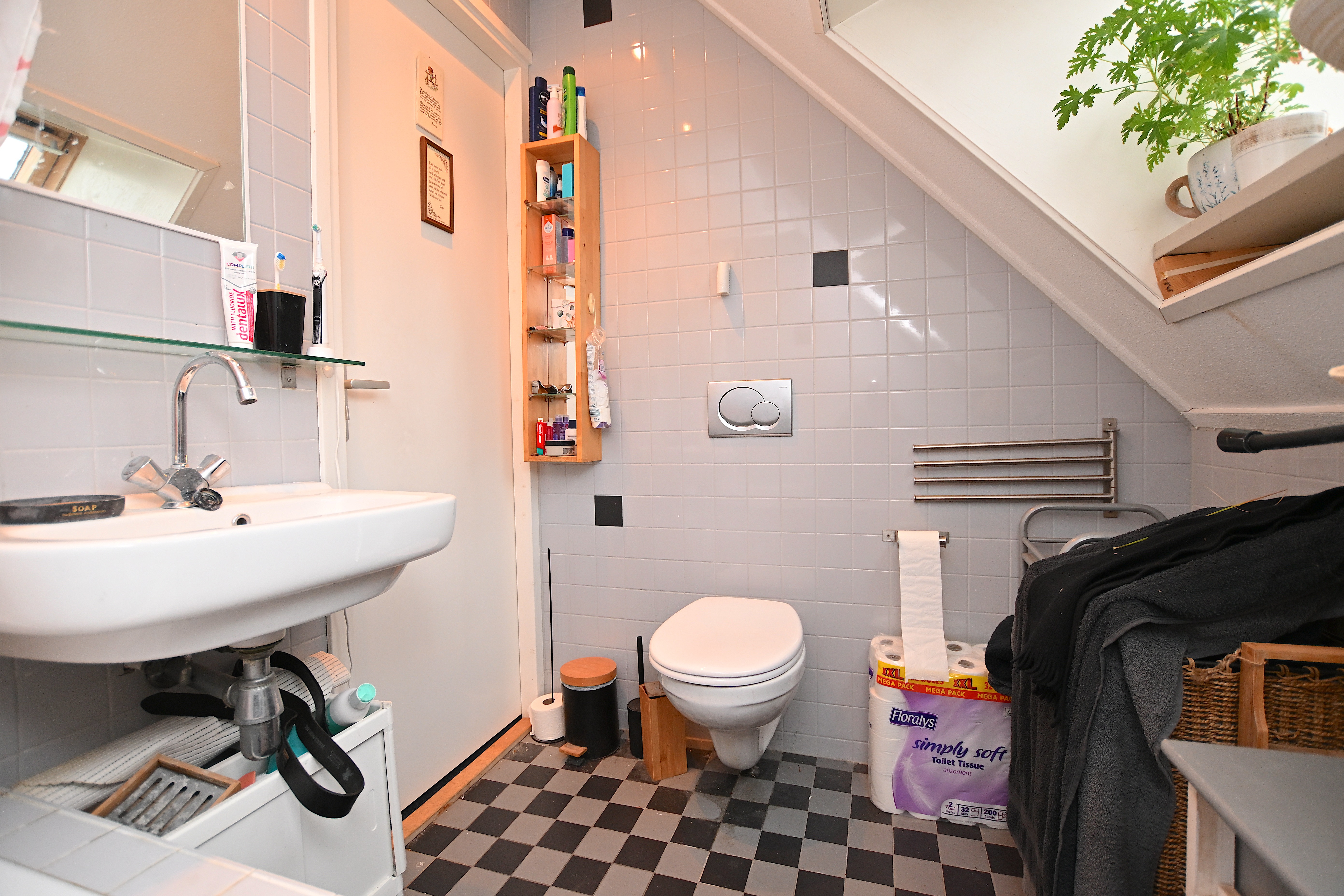 De badkamer is voorzien van een toilet, douche en wastafel.