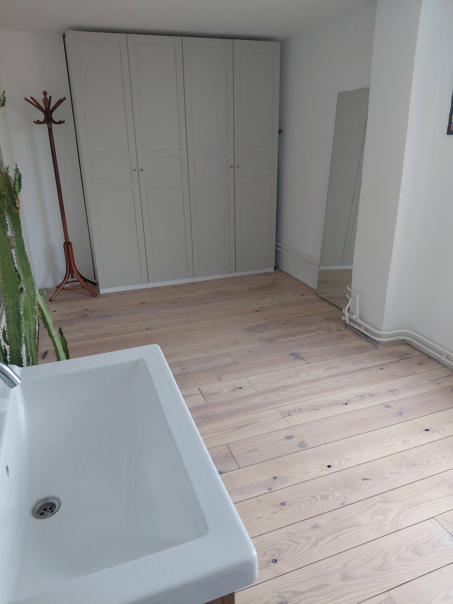 - ruime slaapkamer (16m2) met wasbak en tweepersoonsbed. Op foto nog met kledingkast.