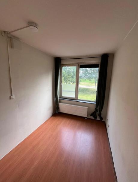 De beschikbare kamer bevindt zich op de eerste verdieping aan de achterzijde van de woning met uitzicht over de groenstrook achter de woning.