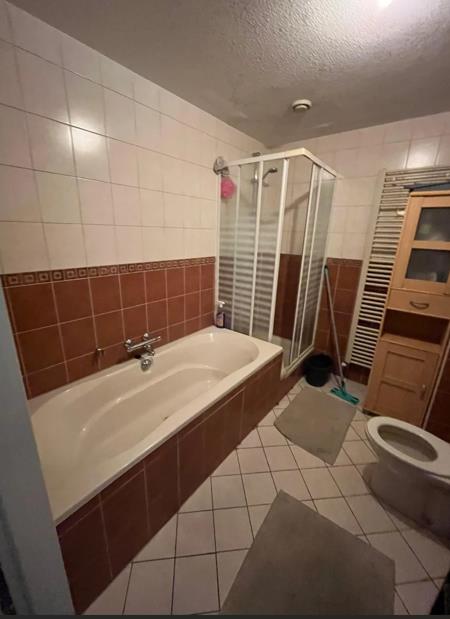 De badkamer bevindt zich op de tweede verdieping en is uitgerust met een bad, douche, wasbak en toilet.