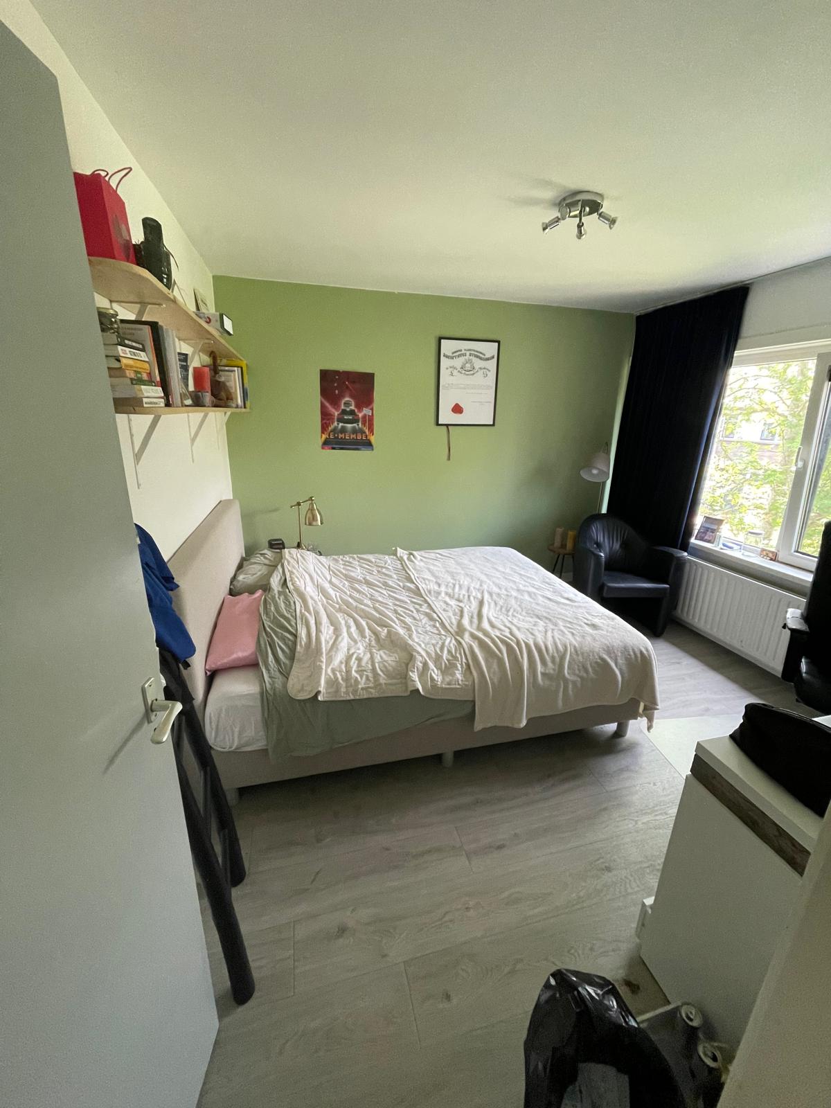 De te verhuren slaapkamer is aan de oostzijde van het huis en is 14m2, het kleinere kamertje ernaast is 6m2, perfect voor een bureau om er een studeerkamer van te maken met een ingebouwde kast. De prijs voor deze kamers samen is 800 euro (inclusief gas, water, elektriciteit).