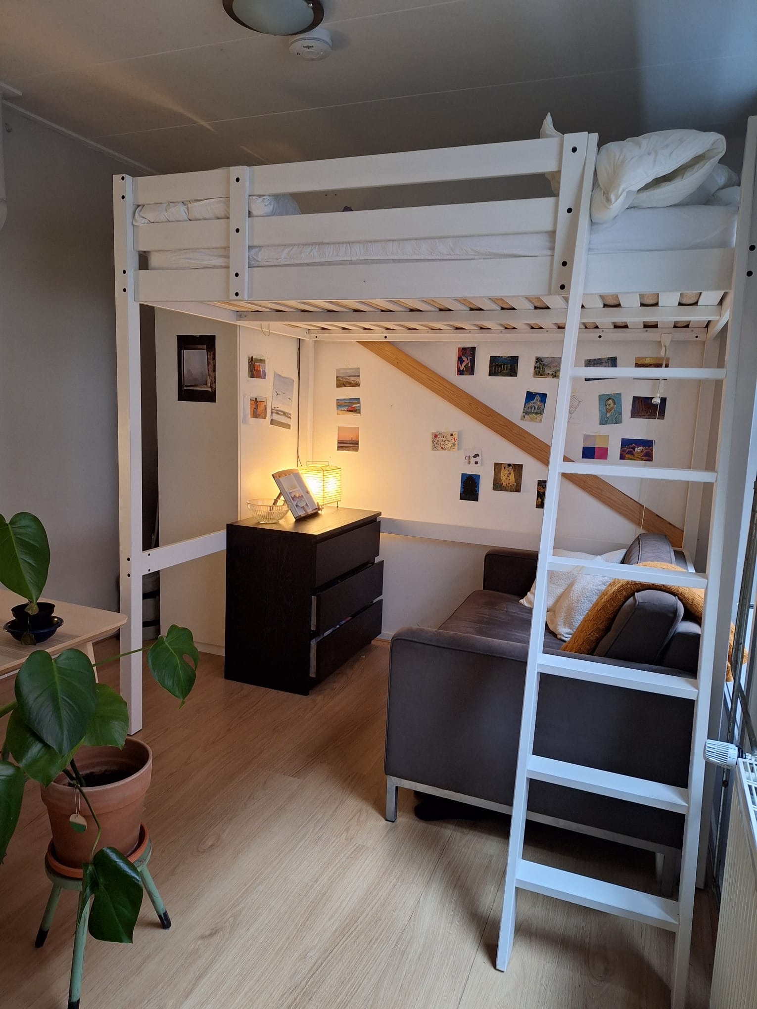 In de kamer staan momenteel een hoogslaper (incl. matras), kledingkast, bank en een zwart kastje van de huidige huurder.