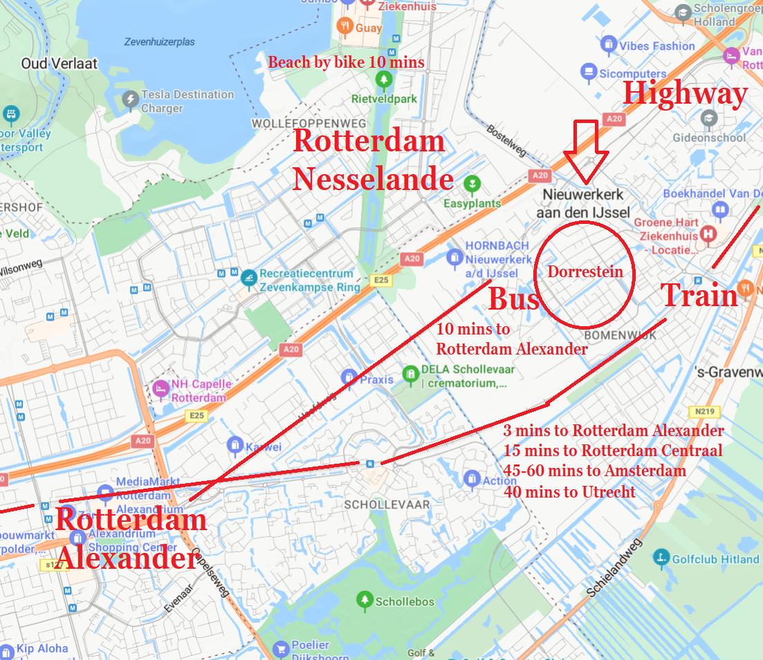 * Train station with direct connection to Rotterdam Alexander (5 mins), Rotterdam Centraal (15 mins) & Amsterdam Centraal (55 mins).