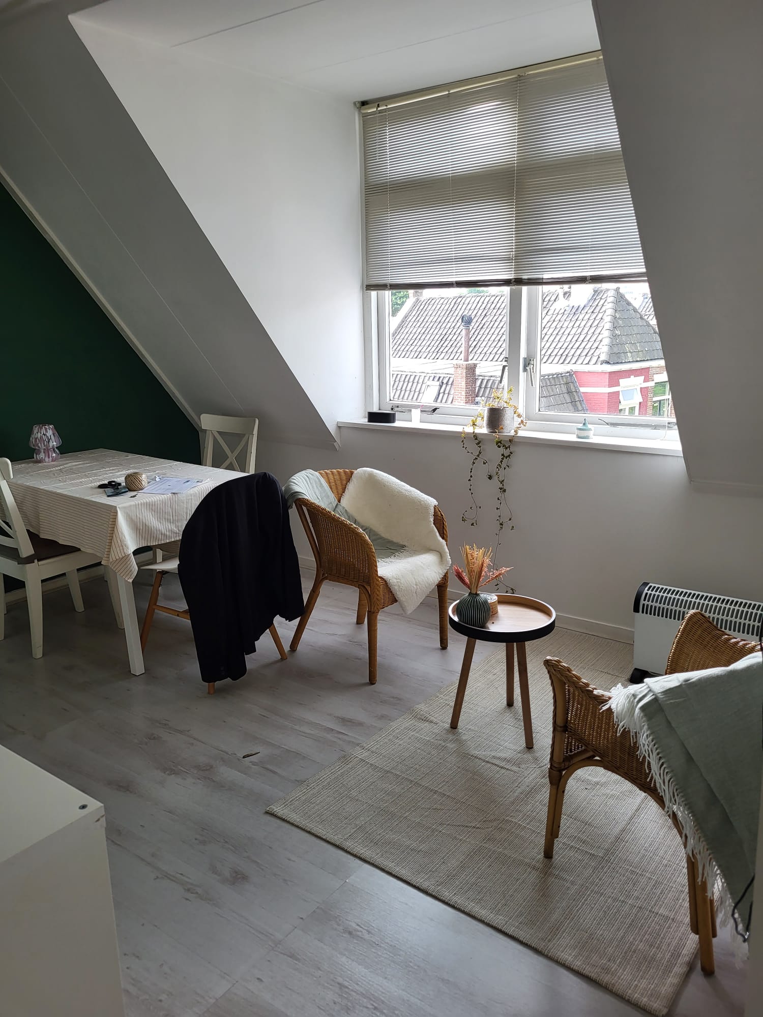 De kamer betreft een bovenverdieping in een studentenhuis..