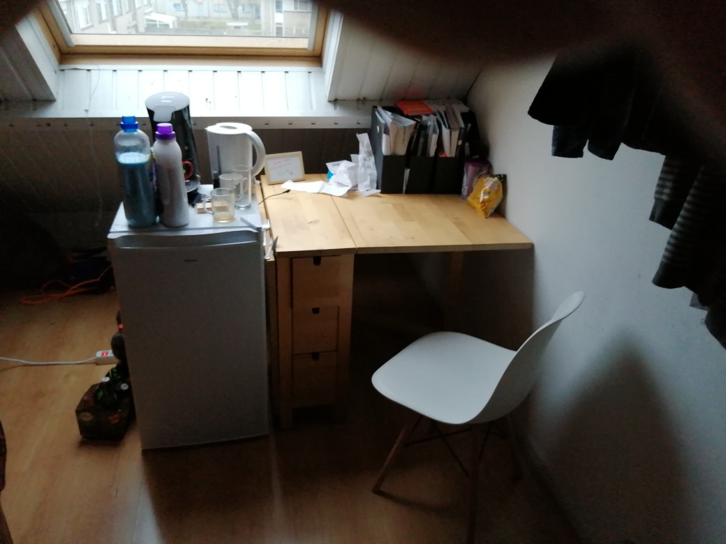 Ruime kamer van 20m2, Veluxdakraam, Bank en bed en bureautje,centrale verwarming met gebruik van Douche/Toilet/Was - en droogmachine en keuken.