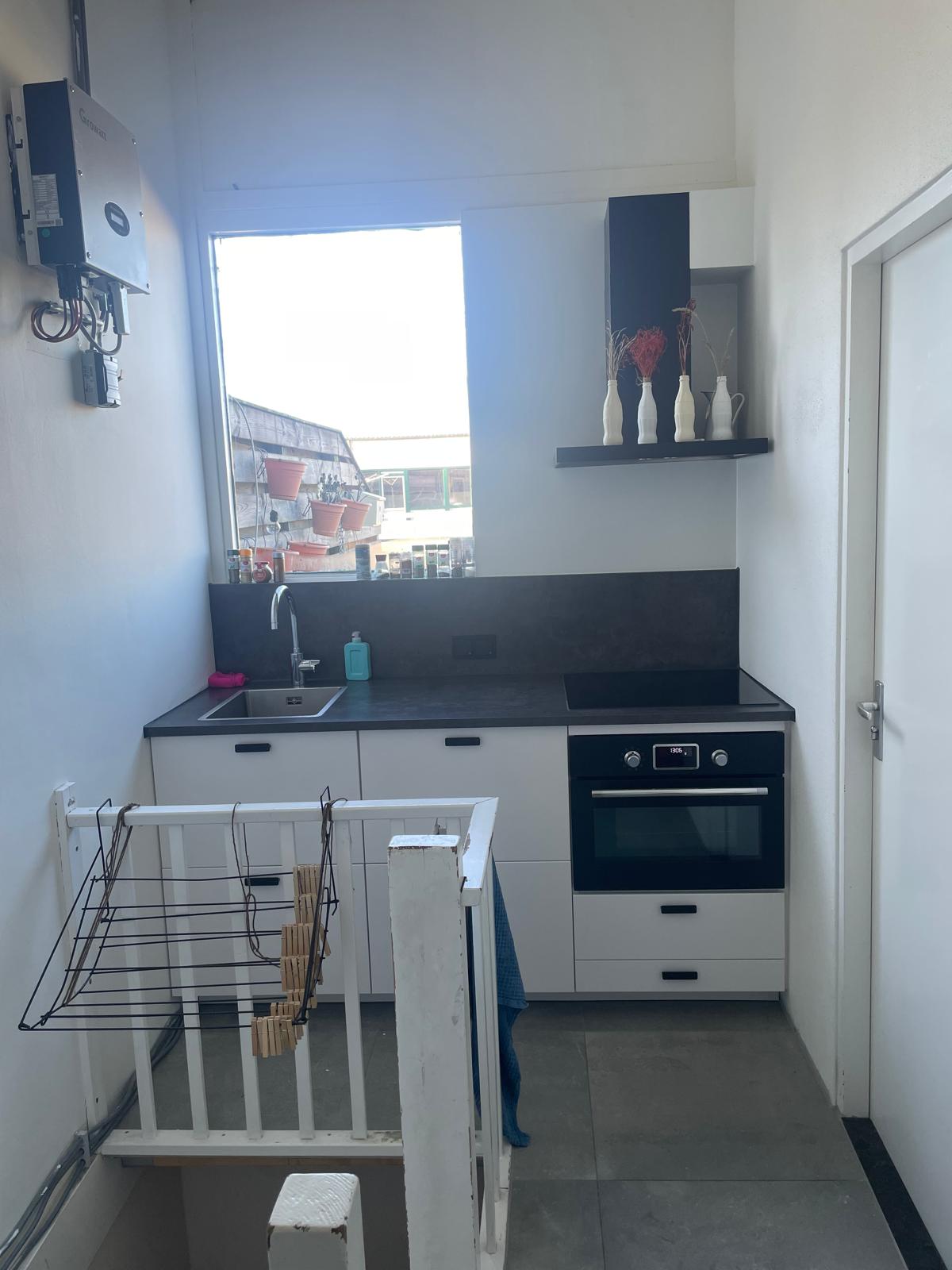 Als bewoner van deze zolderkamer beschik je over een eigen keuken met daarin een inductie-kookplaat, combi-oven en koelkast.