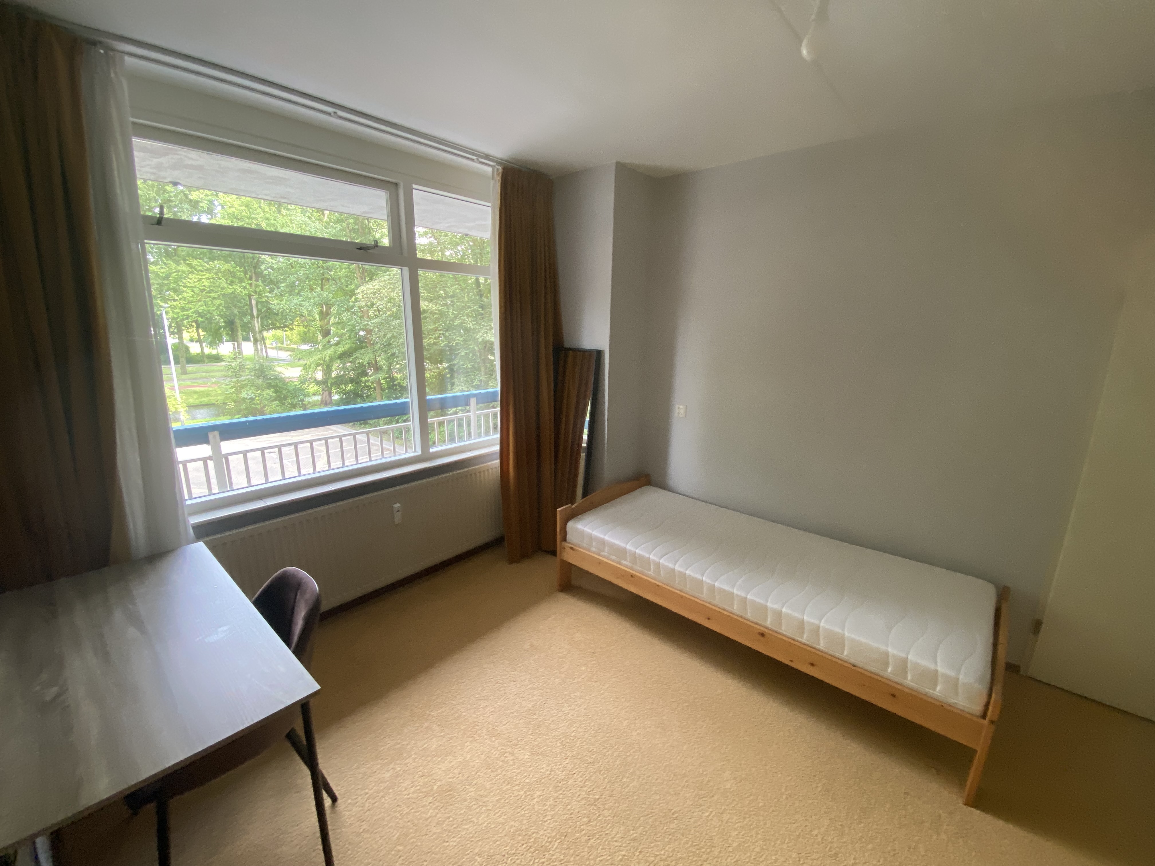 Daarnaast is de kamer al gemeubileerd met een bed, bureau, bureaustoel, ingebouwde kast, staande spiegel en bureaulamp (er staat ook nog een 1 persoonssofa). Verder valt het licht mooi binnen en heeft de kamer gordijnen, tapijt en is het zachtgrijs geverfd. Bovendien deel je een berging, , keuken, badkamer en wc met max 3 andere meiden.