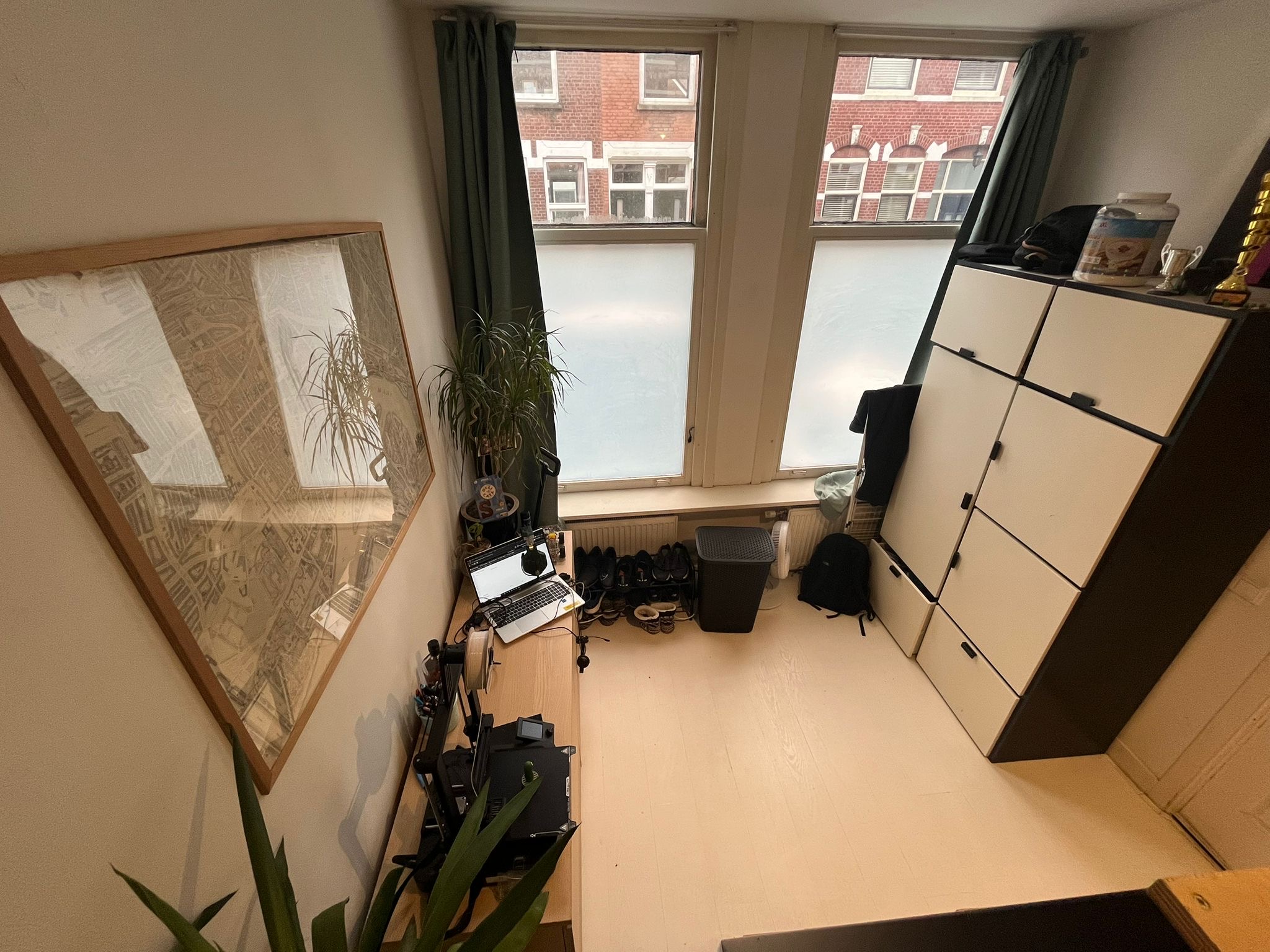 Je woont met 4 andere werkende huisgenoten met de leeftijden tussen 24-28. Het huis is groot en bestaat uit drie verdiepingen. Echter is het wel een oud huis, wat zo zijn gebreken kan hebben. Je hebt je eigen kamer op de begane grond, naast de voordeur en woonkamer, aan de straat kant.
