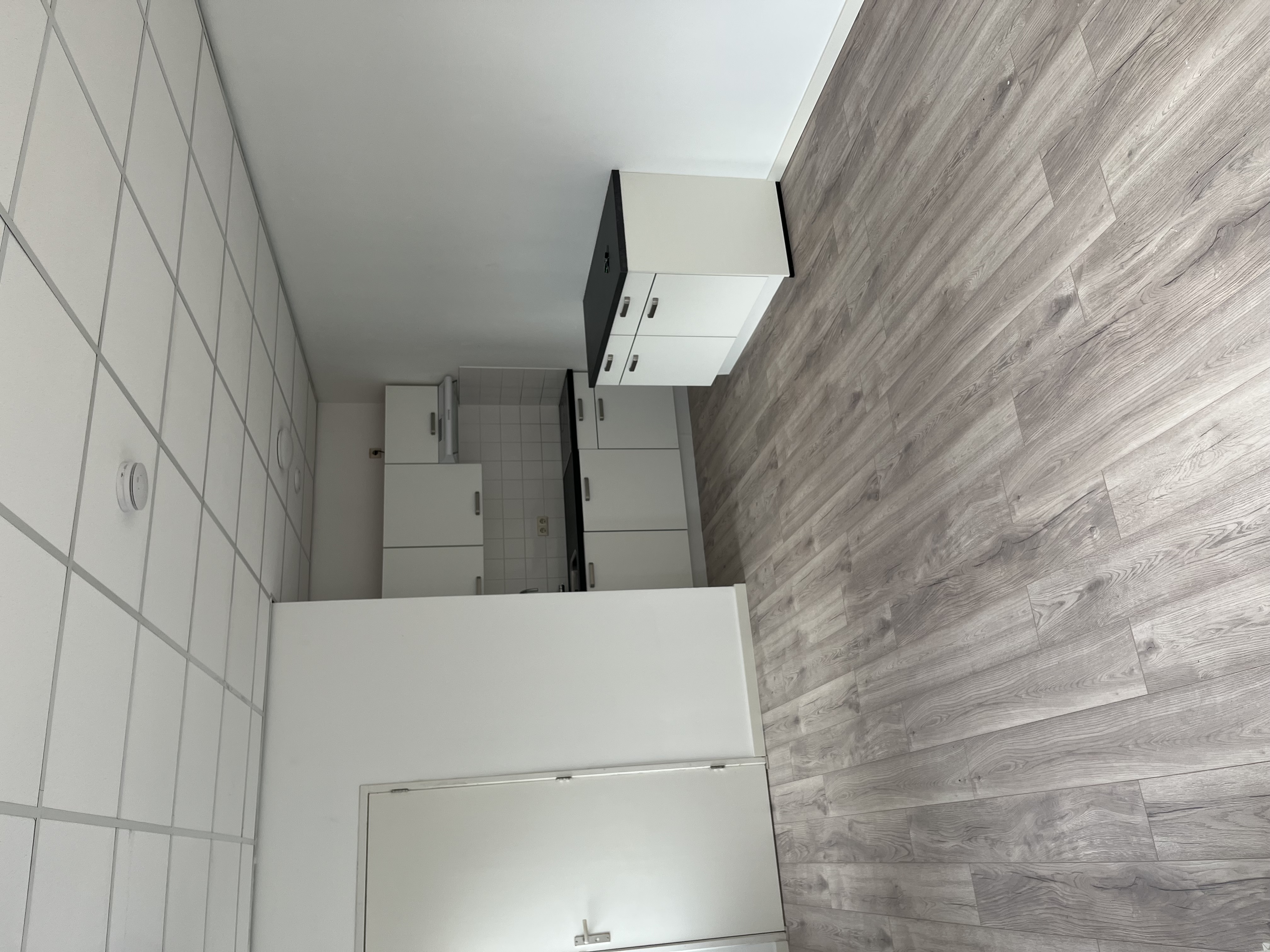 Een badkamer met douche, toilet en wasbak. De keuken is uitgerust met een ingebouwde inductiekookplaat, afzuigkap en koel-/vriescombinatie.