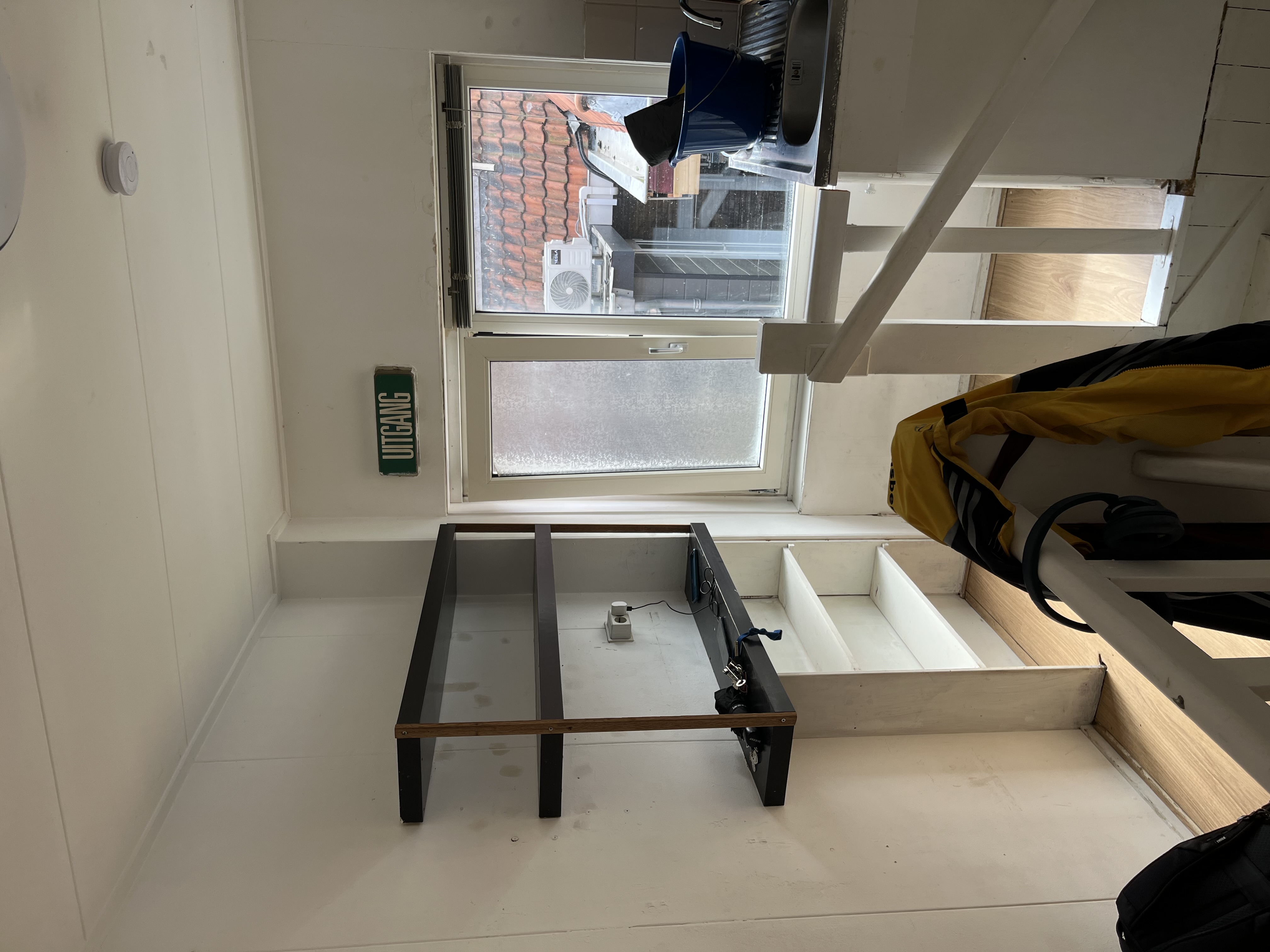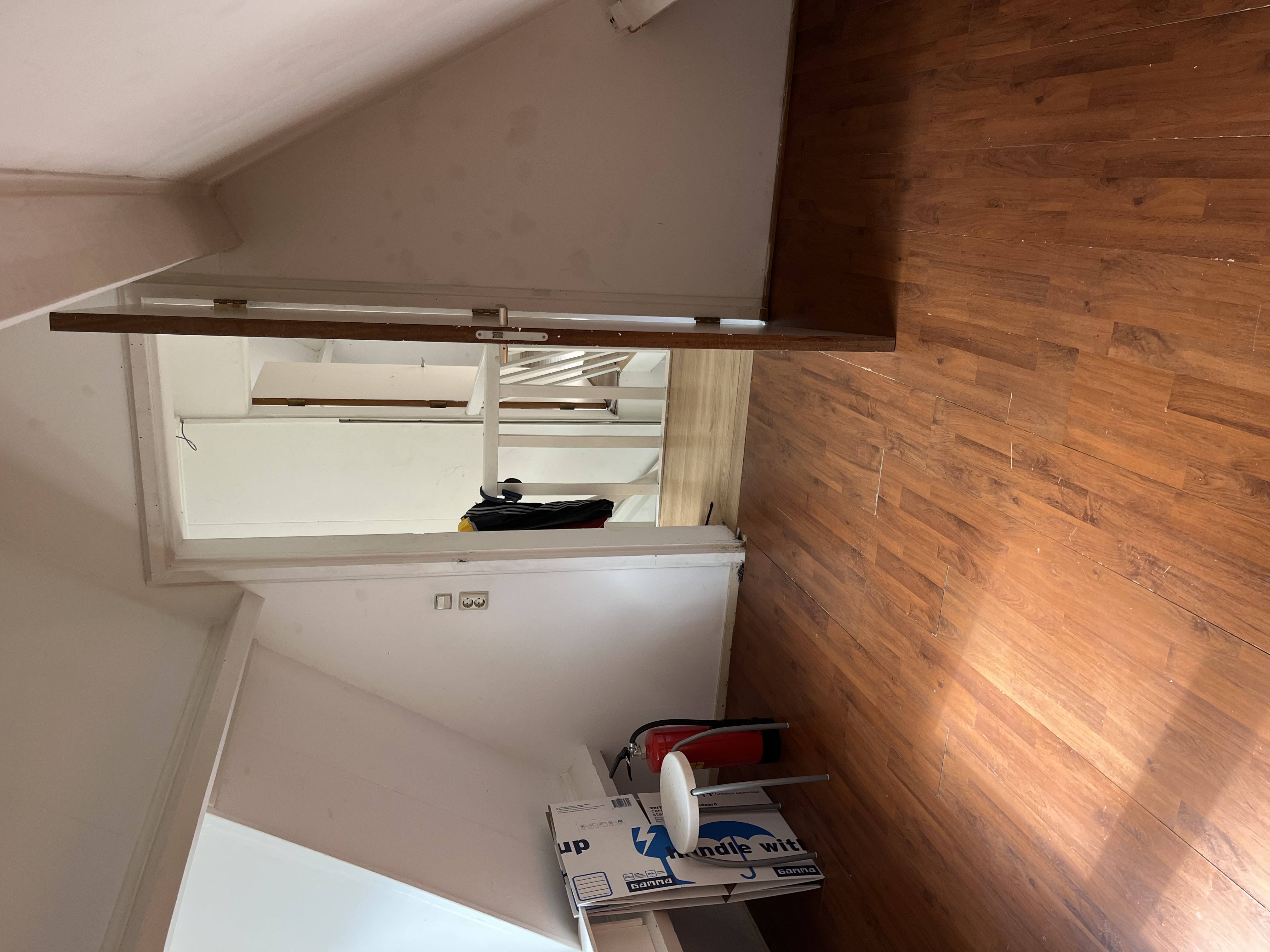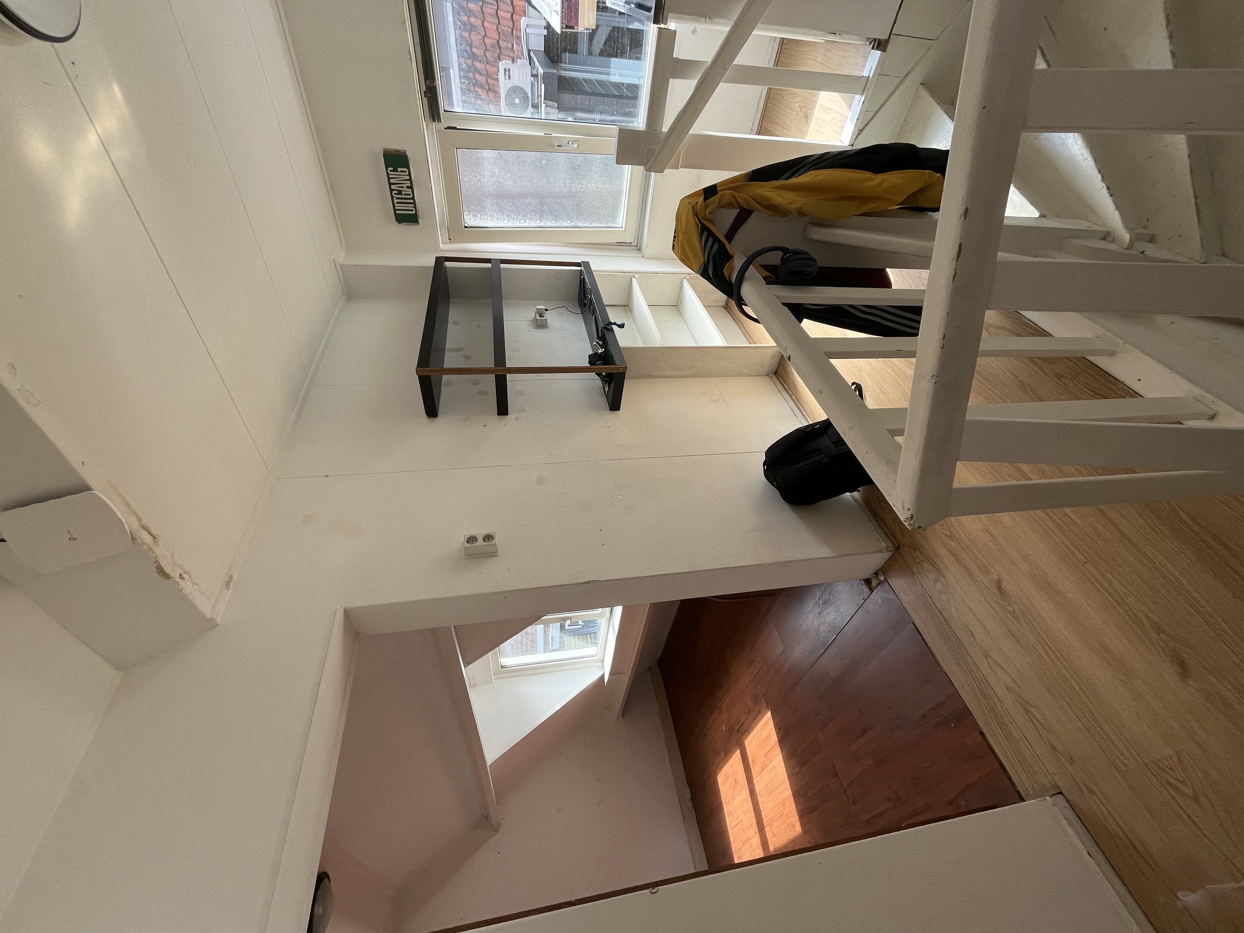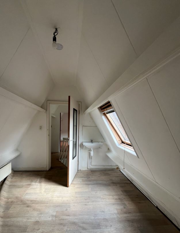 De betreffende kamer is gesitueerd op de bovenste etage van het pand. Het beschikt over een eigen wasbak. De kamer is opgedeeld in twee stukken, waardoor slaapgedeelte en woongedeelte van elkaar gescheiden kunnen worden. De voorzieningen zoals keuken, douche en toilet worden gedeeld met de 5 andere medebewoners.